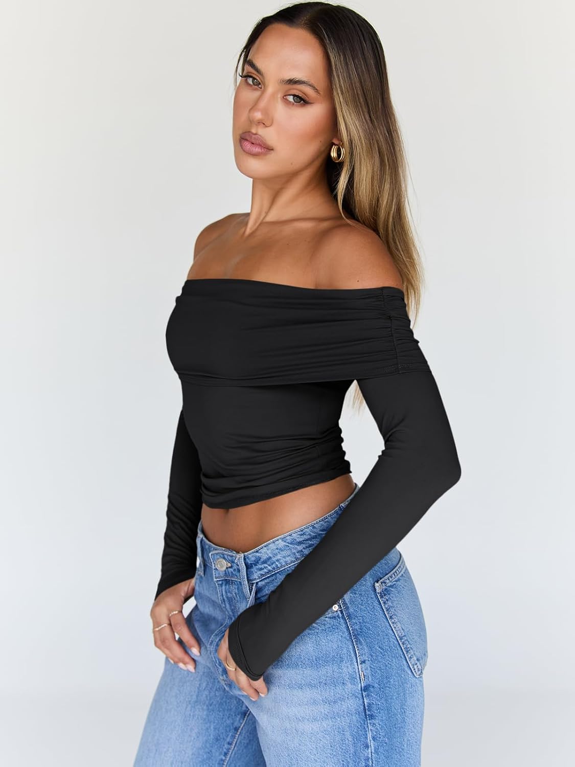 Trendy Queen Women Long Sleeve Shirts Off Shoulder Tops Going Out Crop Sexy Slim Fitted Y2K Fall Outfits 2025 Fashion Clothes
