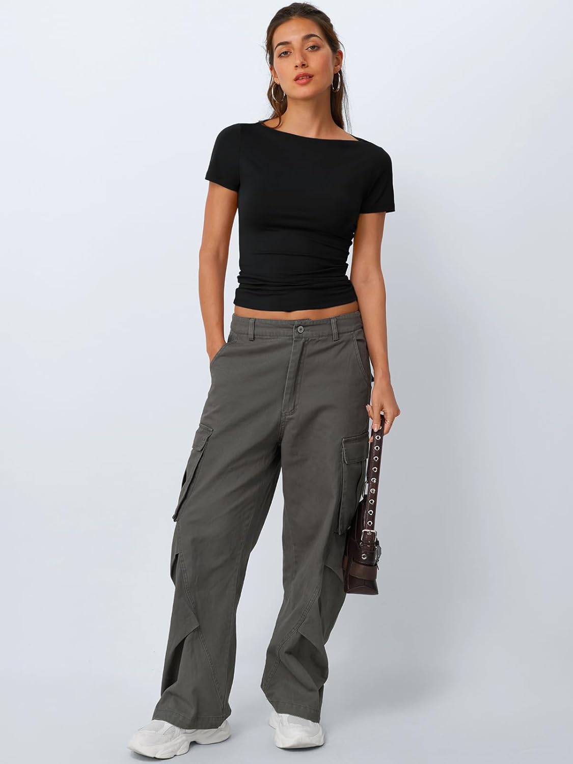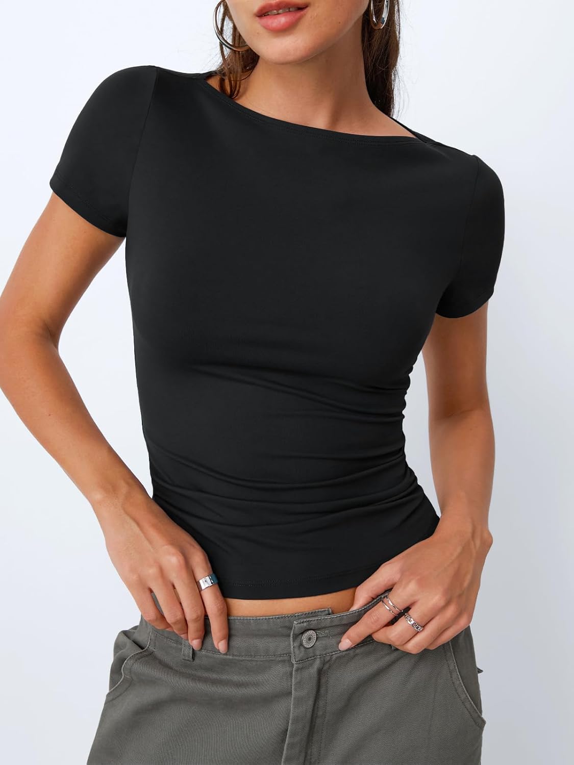 Trendy Queen Womens Boat Neck Tops Short Sleeve T-Shirts Slim Fit Compression Summer Y2k Basic Clothes 2025