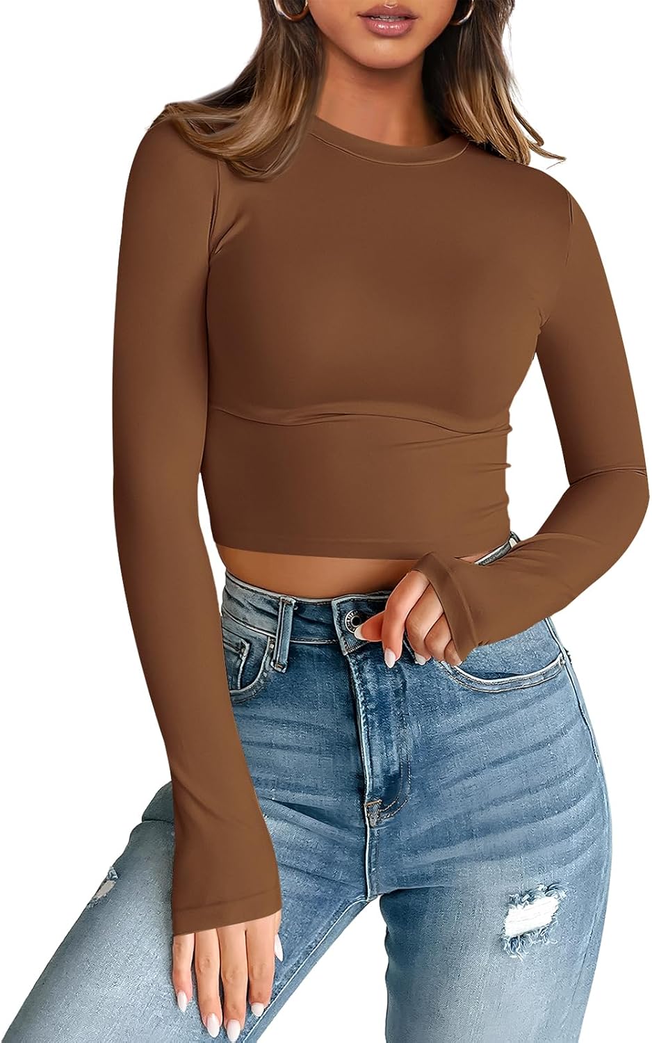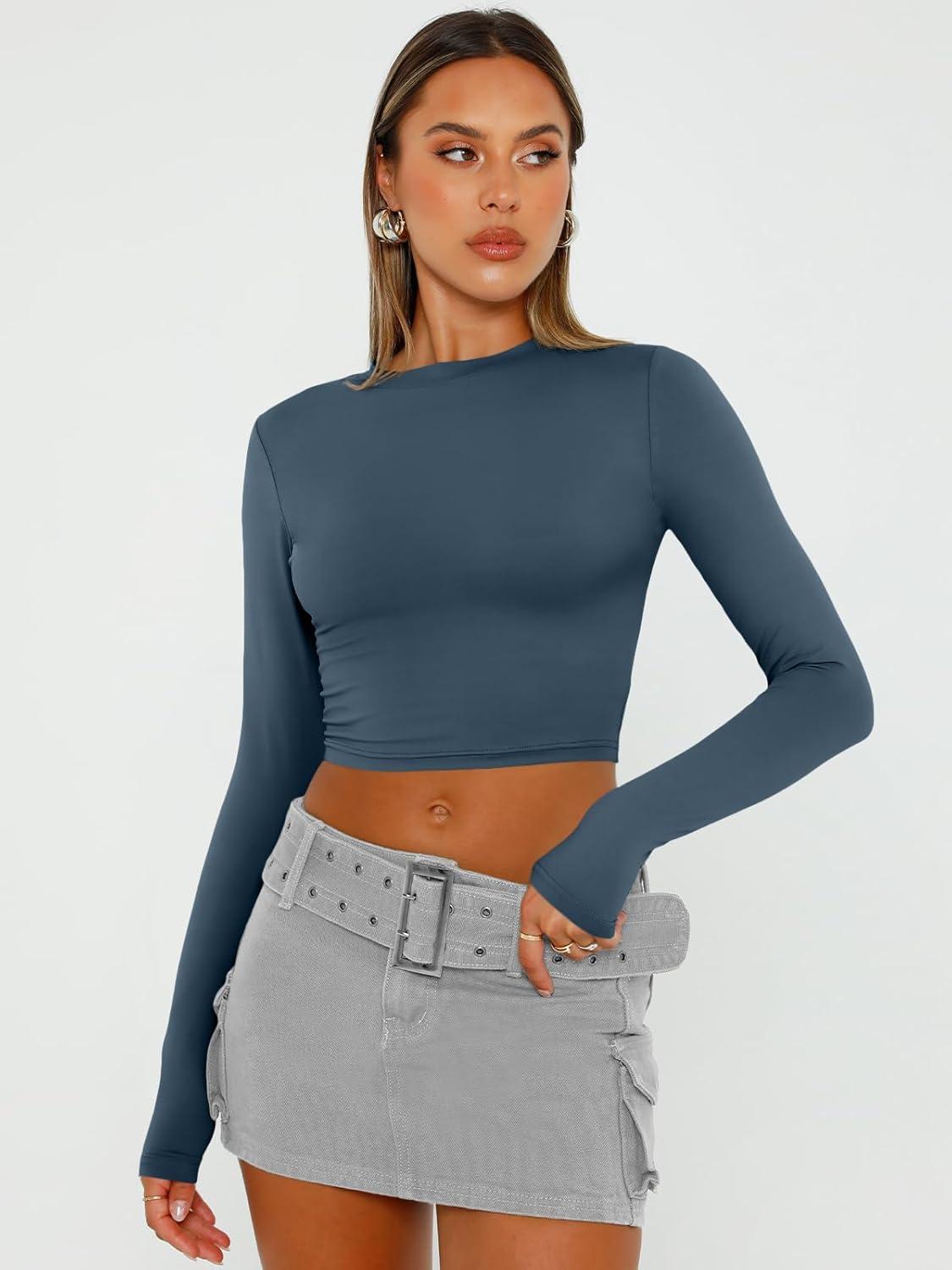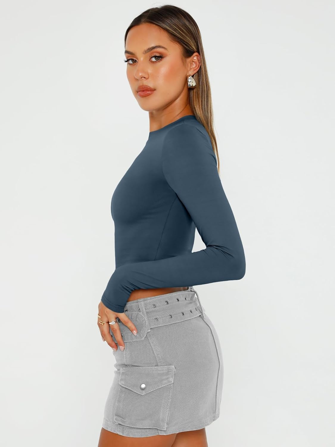 Trendy Queen Womens Long Sleeve Crop Tops Basic Slim Fitted Shirts Casual Fashion 2025 Going Out Y2k Tops Teen Girl Clothes