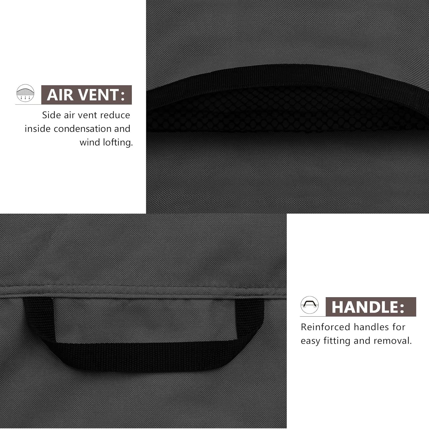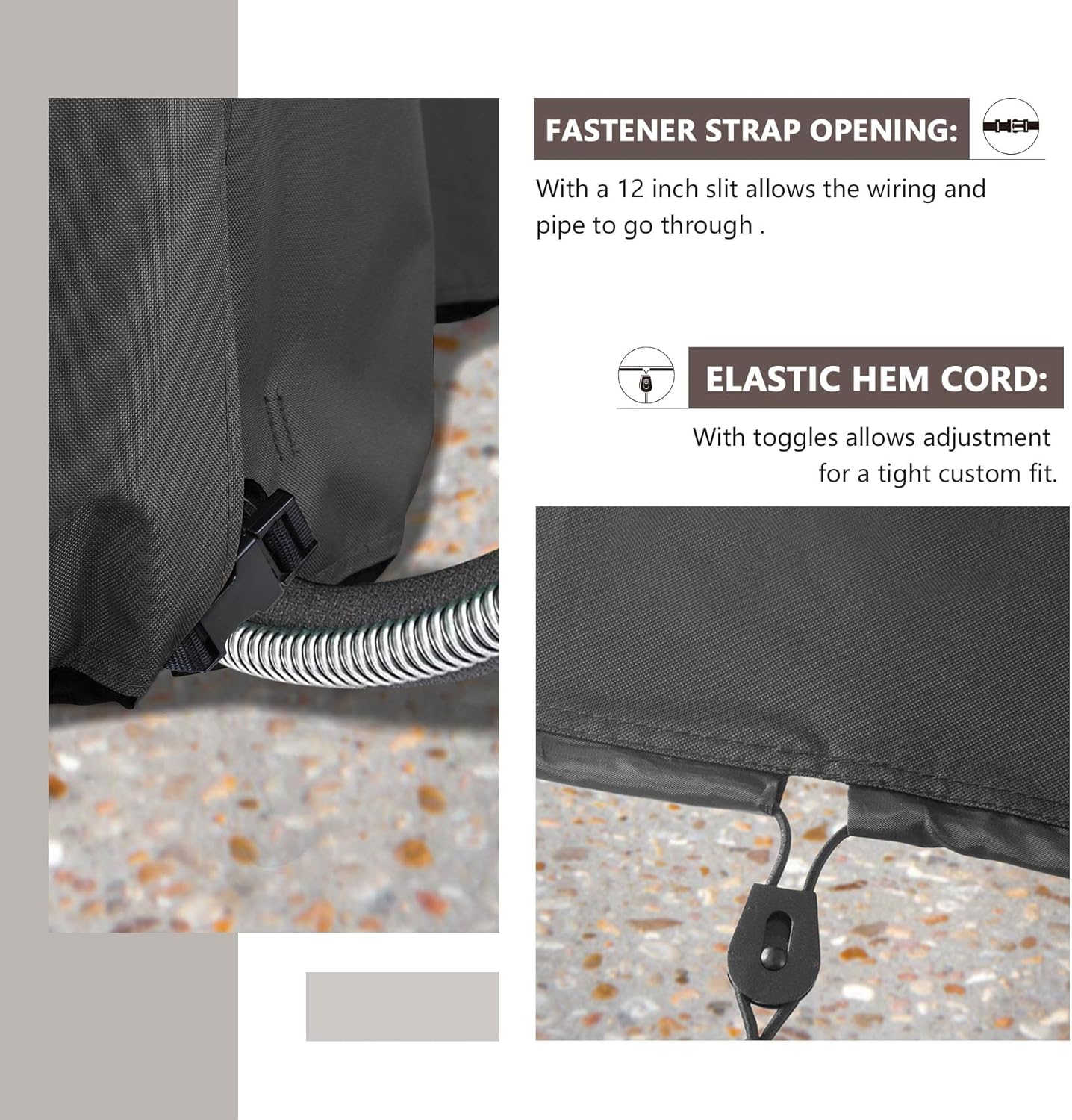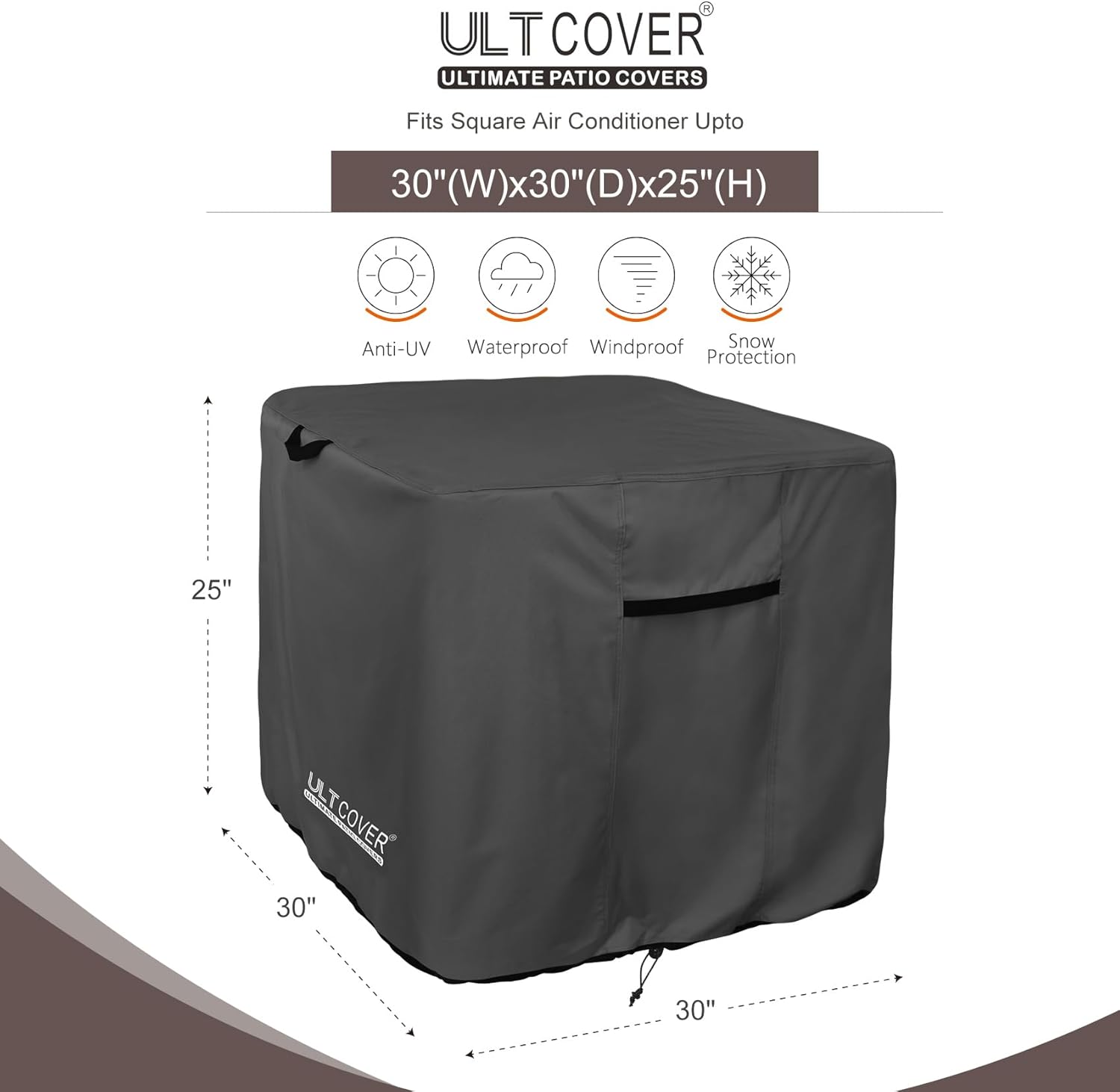 About this itemnGeneral to fit outside AC unit size up to 30(W)x30(D).nMade of 600D polyester canvas complex with waterproof backing. Tough enough to keep rain, hail, snow, dust, leaves and bird droppings away.nWell-made structured air vents and handles at two sides keep ventilation, prevent the cover from being blown away, also keep your furniture dry and in good condition.nPlastic clips & elastic draw cords secured to units bottom, especially during high winds and severe weather.nFull coverage design avoids the exposure of air conditioner in the sun makes your outside units always look like new.