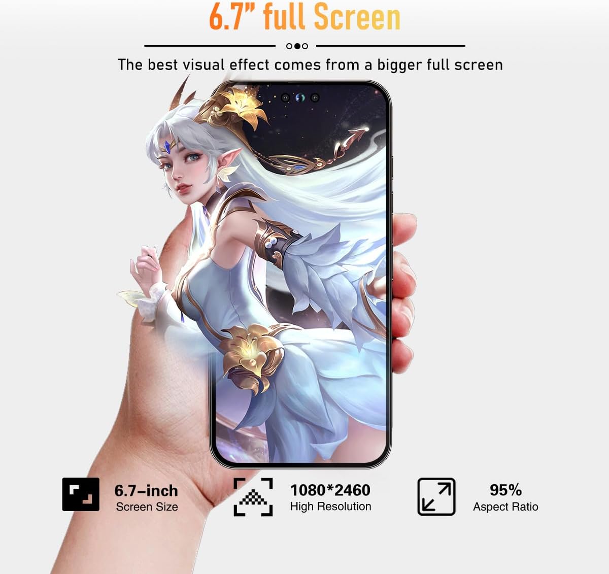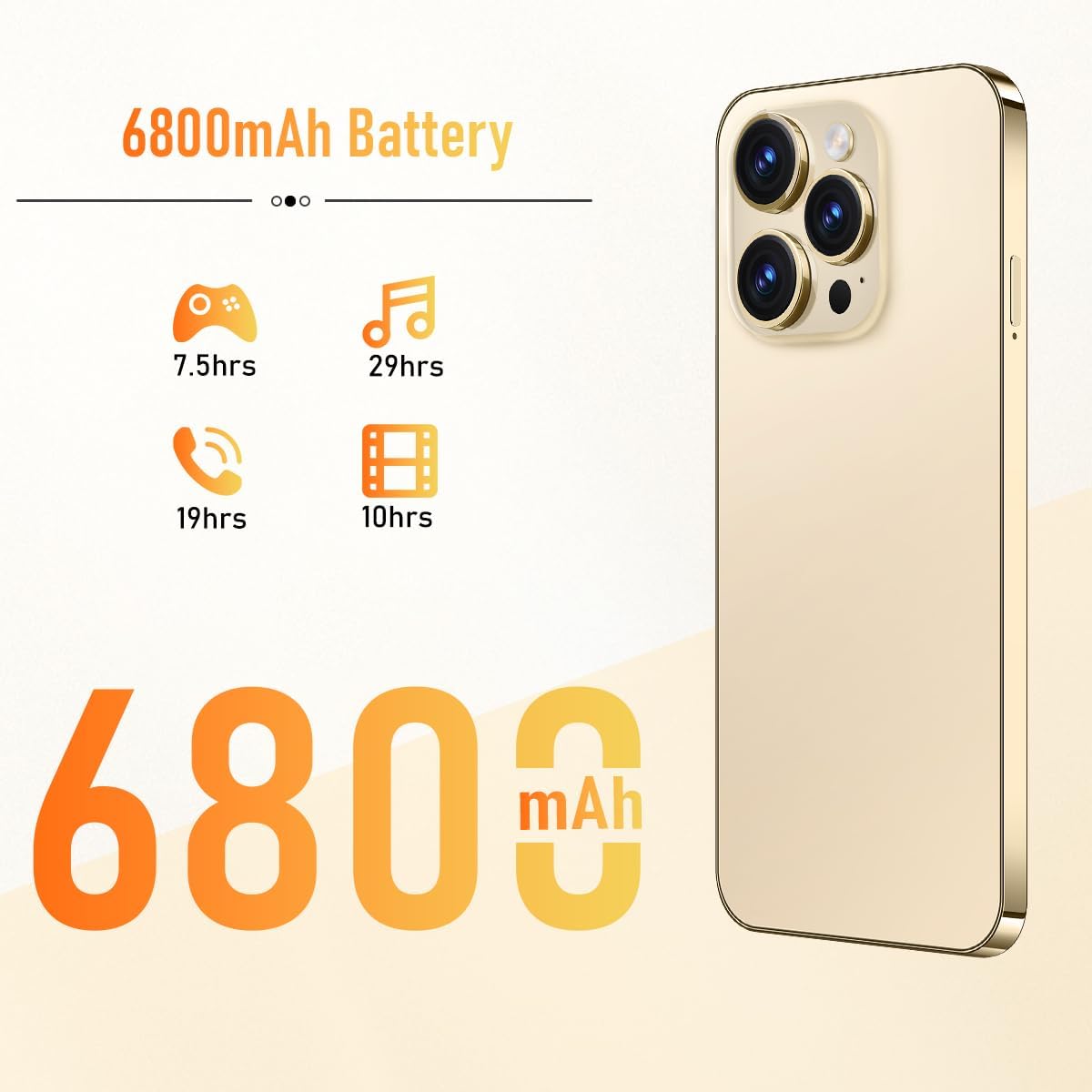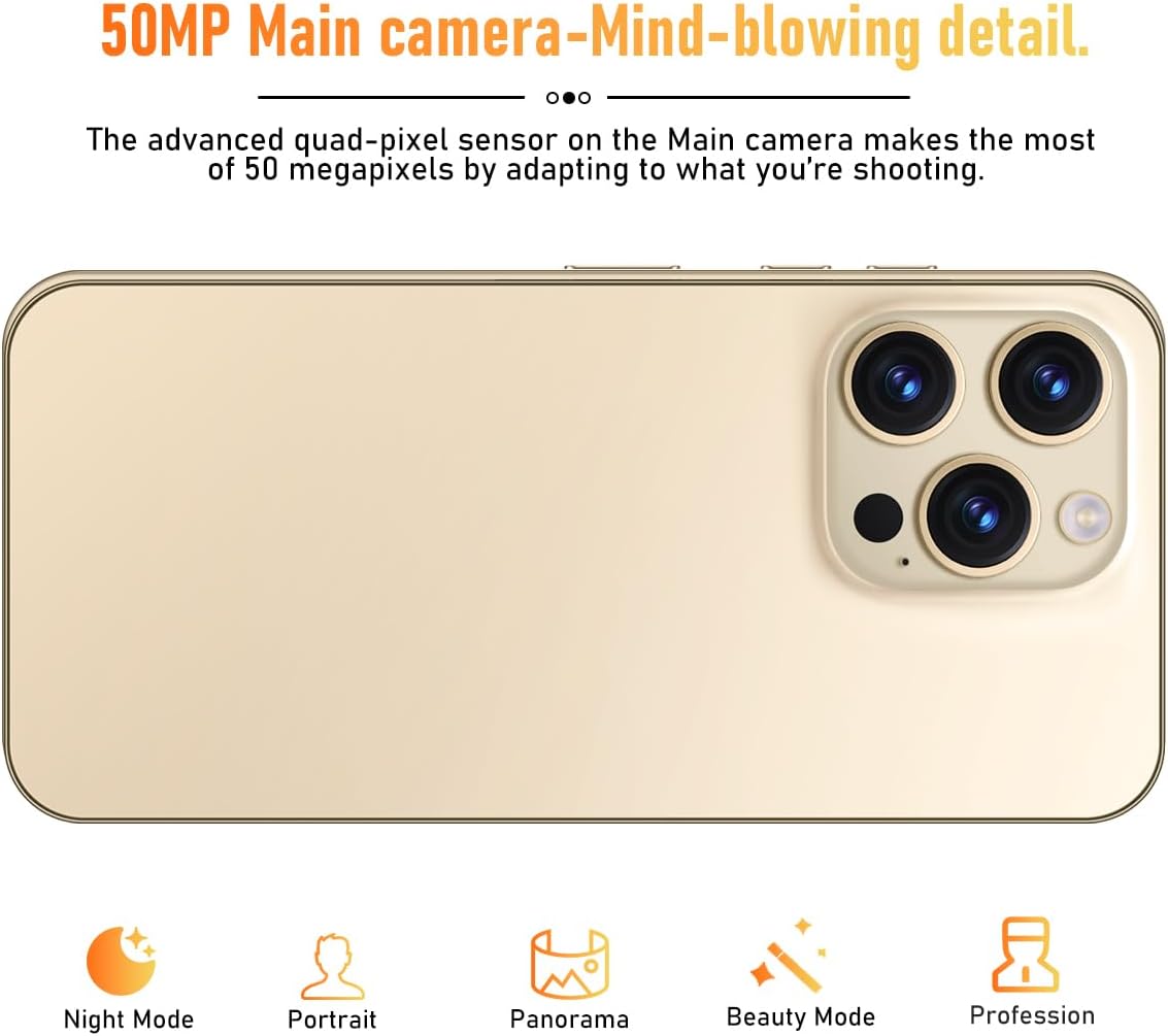 About this itemn5G dual SIM phone – I14 ProMax supports 5G/4G/3G/2G cellular networks with a wider range of bands. Unlocked for All Carriers.nAndroid 13 unlocked smartphone comes equipped with a 6800mAh large battery, providing exceptional battery life! Enjoy 28 hours of talk time, 38 hours of music playback, and 12 hours of gaming fun. Intelligent AI battery management cleverly saves power, extending standby time. Say goodbye to battery worries.nThe 6.7-inch HD LCD screen brings your photos, movies, videos, and games to life. Experience your favorite content vividly on this stunning widescreen.nI14 ProMax Unlocked Android phone has facial recognition and fingerprint unlocking features, eliminating the need for complicated passwords. surpassing traditional methods of identity verification, seamlessly integrating security and convenience.nThe I14 ProMax android phone features a comprehensive camera upgrade, with a main 50MP camera and a 2MP macro lens, equipped with advanced image processing capabilities to showcase vibrant colors and striking details. The 24MP front camera includes built-in portrait enhancement for outstanding selfies and video calls.nThe I14 ProMax android phone equipped with an 8 octa-core processor and 128GB storage space offers powerful performance and ample room for everything you need.nIn the box: 1 x I14 ProMax smartphone, 1 x phone case, 1 x phone protective film, 1 x power adapter, 1 x USB-C 2.0 charging cable, 1 x earphones, 1 x SIM ejector pin, 1 x user manual.