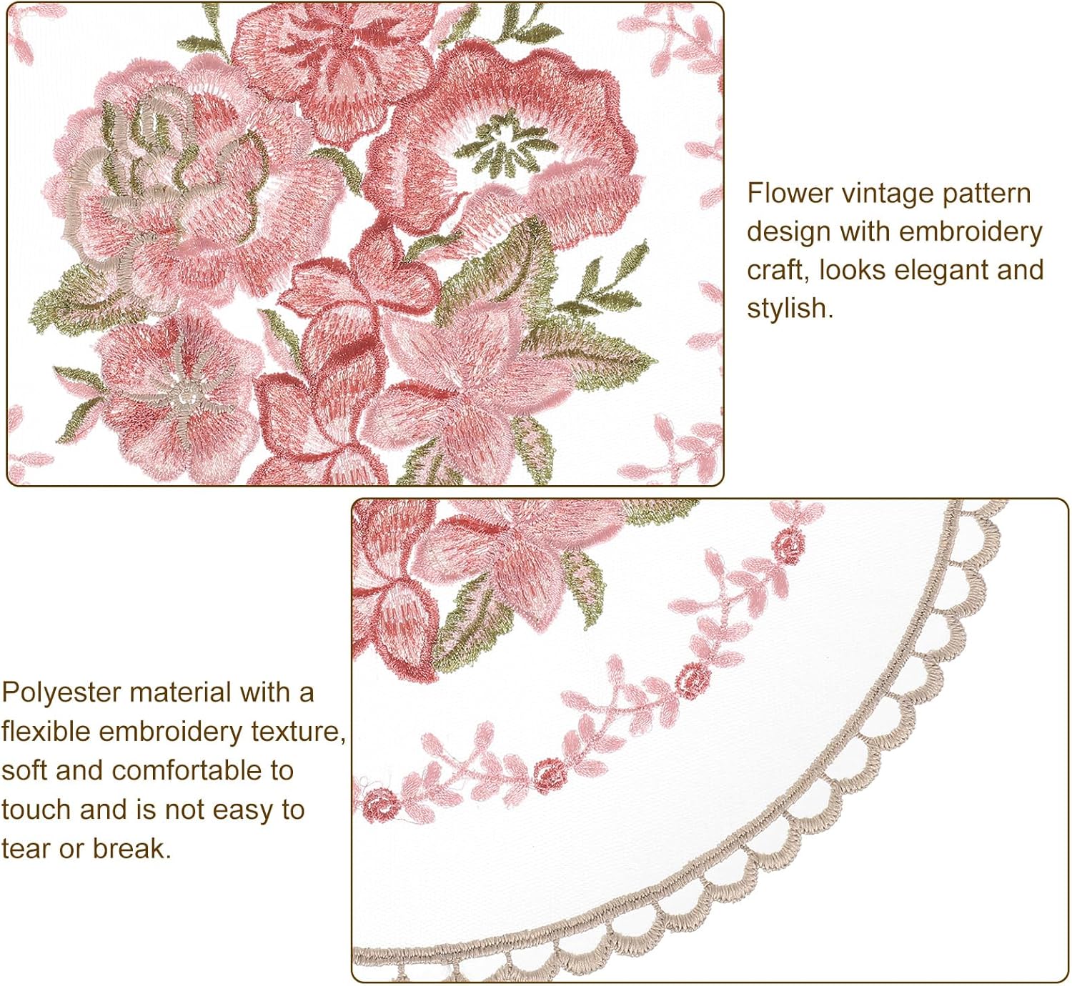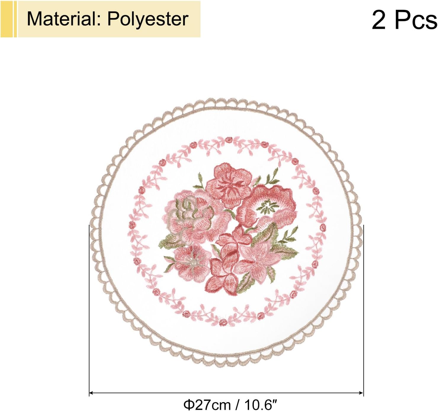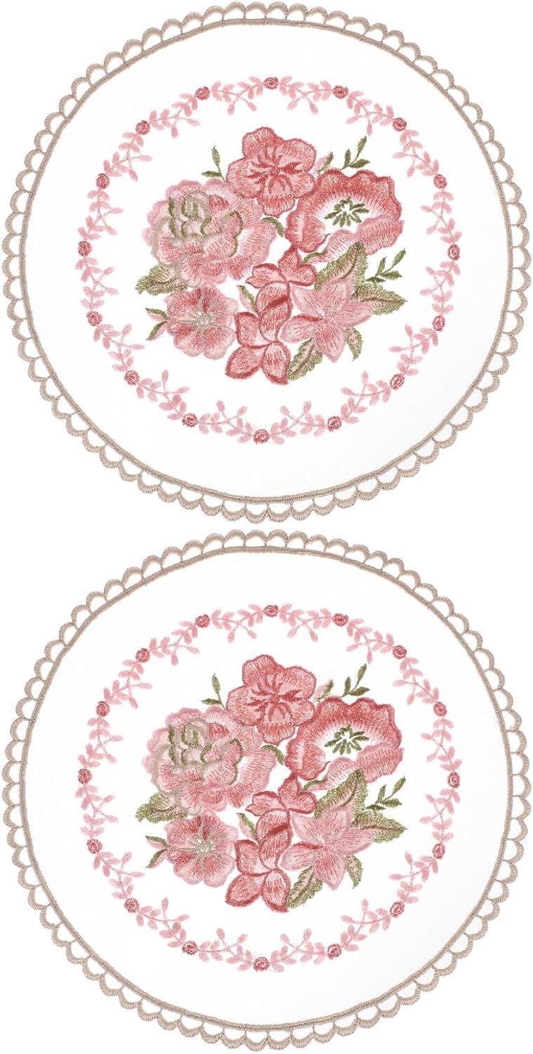 About this itemn[Retro Lace Placemats] This vintage placemat is a handmade embroidery craft, crochet flower lace mat, 10.6×10.6inch, white, 2 pcs.n[Material] Made of polyester, it has good elasticity, is not easy to deform, does not fade, has good wrinkle resistance, wear resistance, heat resistance, and is suitable for long-term use. Soft texture and colorfast, it protects your dining table well from utensil scratches.n[Easy to Maintain] These placemats are easy to use and maintain, they can be folded up and can be hand washed and dry cleaned; air dried, and reused to celebrate other holidays. It will keep you happy and leave a good impression on your guests.n[Delicate Placemats] Our table mat adopts lace embroidery hollow craft and a fashionable retro rose pattern to make it look more elegant and fashionable. Such a beautiful piece will add a touch of luxury and elegance to your home, and party decorations, it will look stylish in any dining room, kitchen, or entryway desk, especially suitable for wedding receptions. It can even be used as a unique gift for a friend.n[Wide Application] Embroidered table mats can be used as dining table mats, decorative mats, flowerpot mats, coasters, fork cutlery spoon holders, etc. Also suitable for decorating cabinets, desks, wooden boxes, TV cabinets, etc. during holidays. Suitable for decorating homes, coffee bars, banquets, etc.