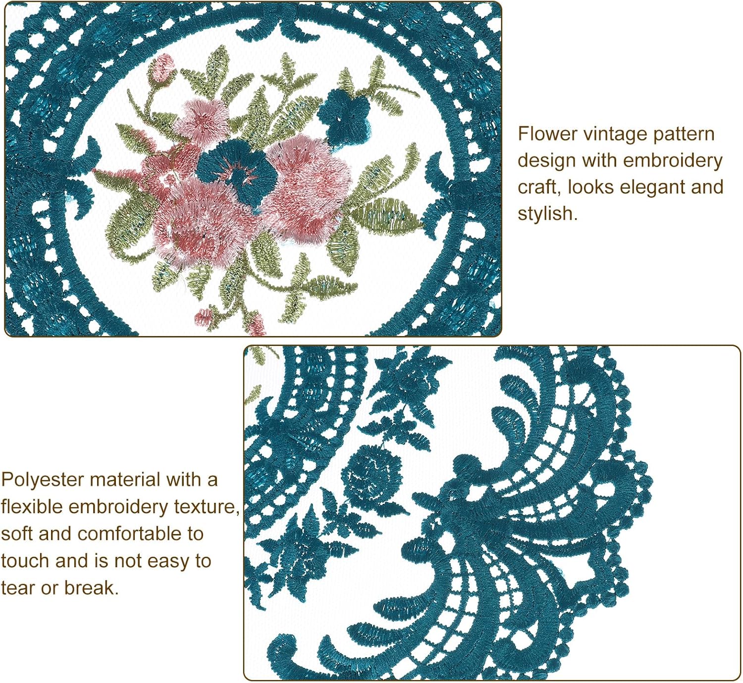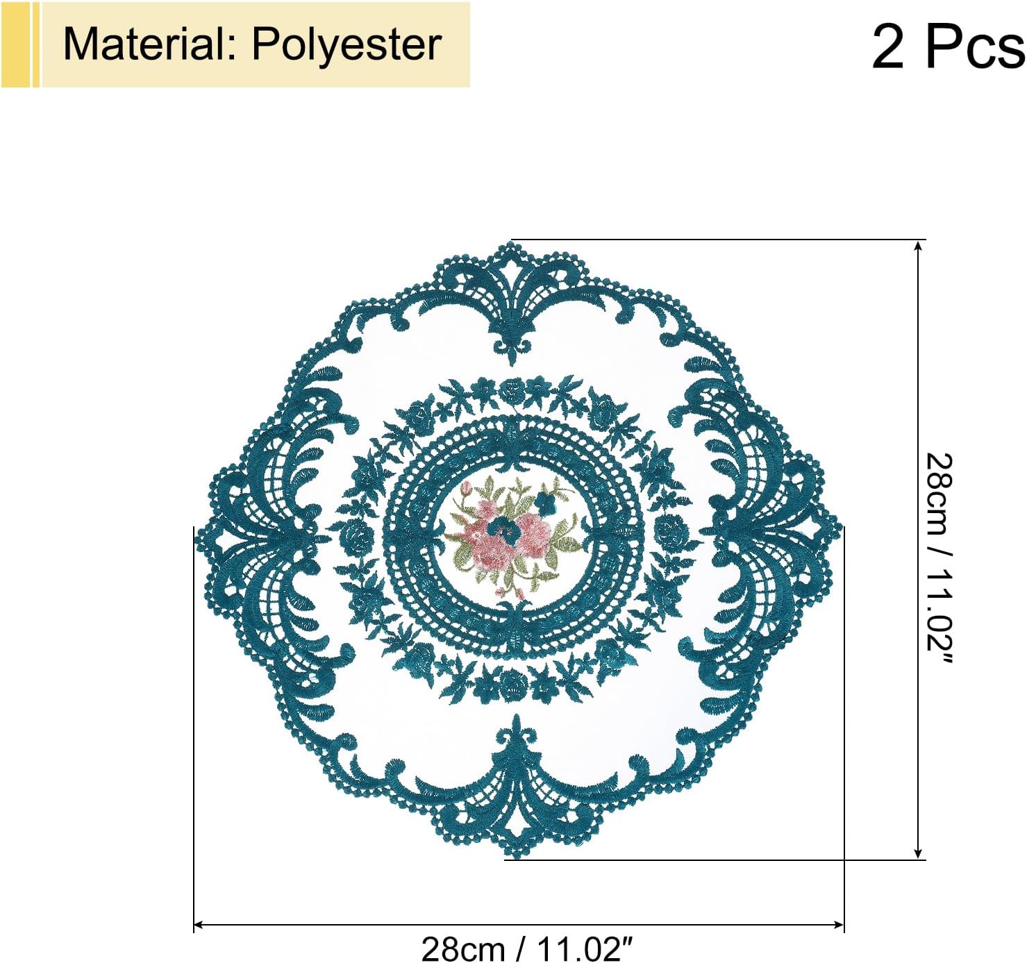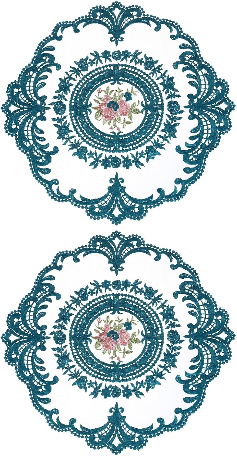 [Retro Lace Placemats] This vintage placemat is a handmade embroidery craft, crochet flower lace mat, 11.02×11.02inch, white, 2 pcs.n[Material] Made of polyester, it has good elasticity, is not easy to deform, does not fade, has good wrinkle resistance, wear resistance, heat resistance, and is suitable for long-term use. Soft texture and colorfast, it protects your dining table well from utensil scratches.n[Easy to Maintain] These placemats are easy to use and maintain, they can be folded up and can be hand washed and dry cleaned; air dried, and reused to celebrate other holidays. It will keep you happy and leave a good impression on your guests.n[Delicate Placemats] Our table mat adopts lace embroidery hollow craft and a fashionable retro rose pattern to make it look more elegant and fashionable. Such a beautiful piece will add a touch of luxury and elegance to your home, and party decorations, it will look stylish in any dining room, kitchen, or entryway desk, especially suitable for wedding receptions. It can even be used as a unique gift for a friend.n[Wide Application] Embroidered table mats can be used as dining table mats, decorative mats, flowerpot mats, coasters, fork cutlery spoon holders, etc. Also suitable for decorating cabinets, desks, wooden boxes, TV cabinets, etc. during holidays. Suitable for decorating homes, coffee bars, banquets, etc.