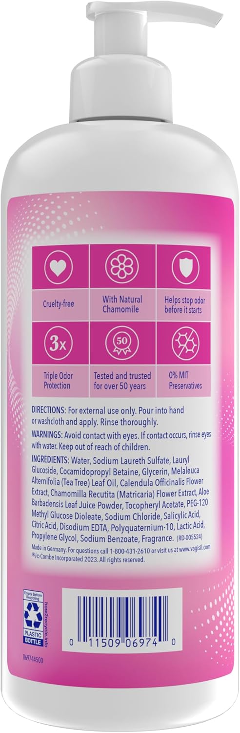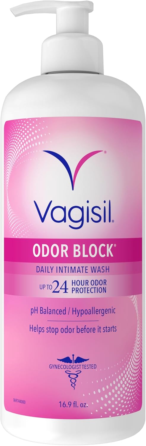 About this itemnIncludes (1) 16.9 oz bottle with pump of Vagisil Odor Block daily intimate vaginal washnAll over body wash with triple odor protection to help keep you feeling fresh and confident all day long.nHas patented Odor Block Technology to help stop odor before it starts. Up to 24 hours of odor protection.nDye-Free, hypoallergenic formula. Gynecologist and clinically tested. With natural aloe, chamomile, and calendula.nLight and clean scent. Tough on odor, gentle on skin. Also try Odor Block intimate wipes, powder, and dry spray.