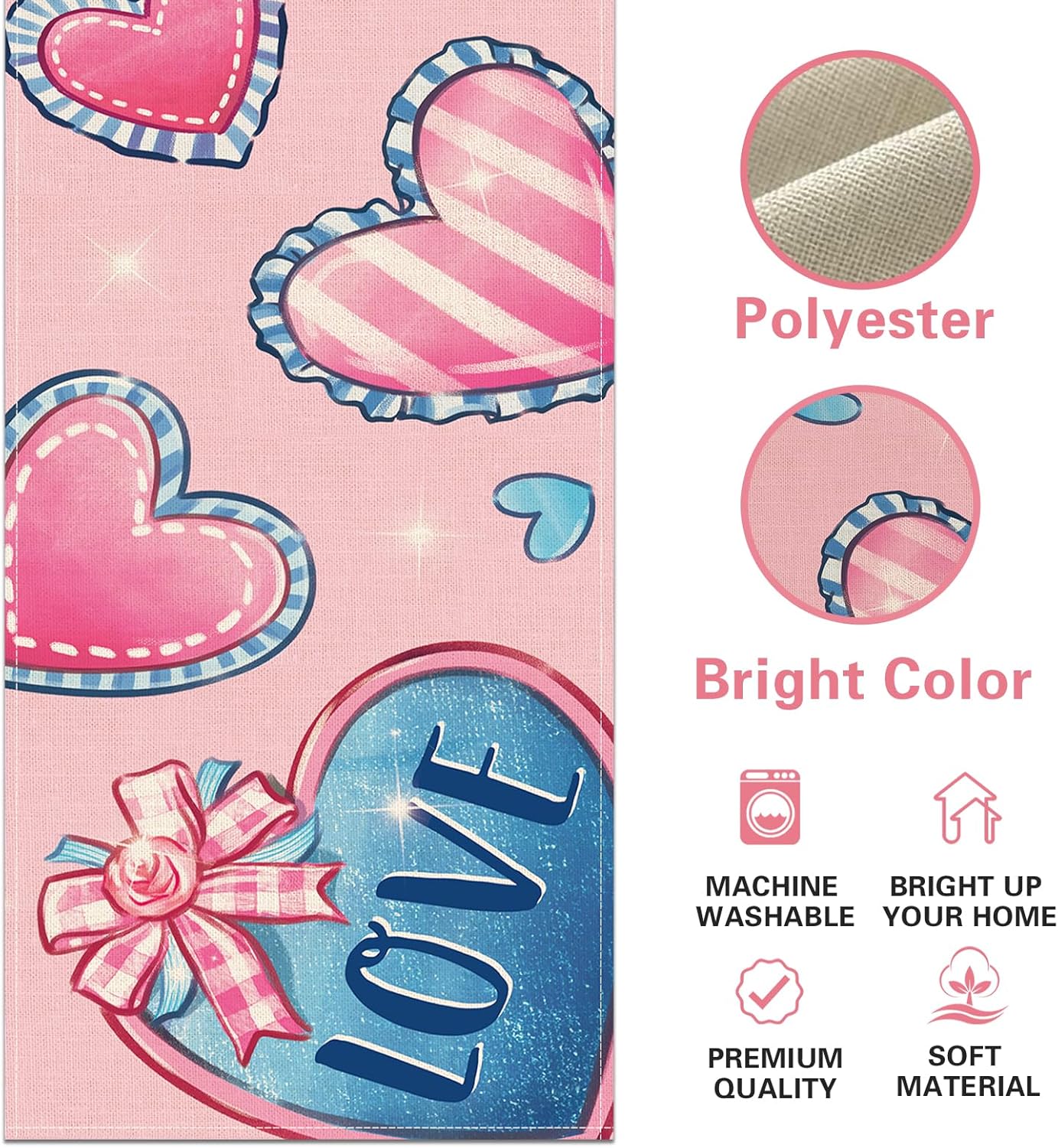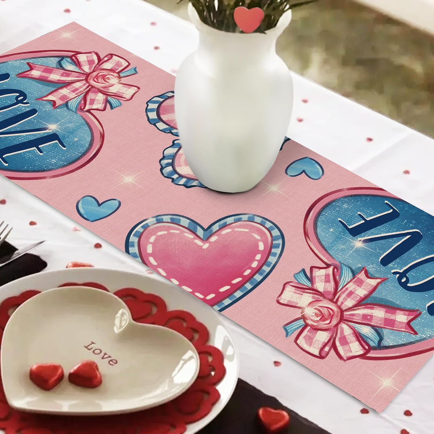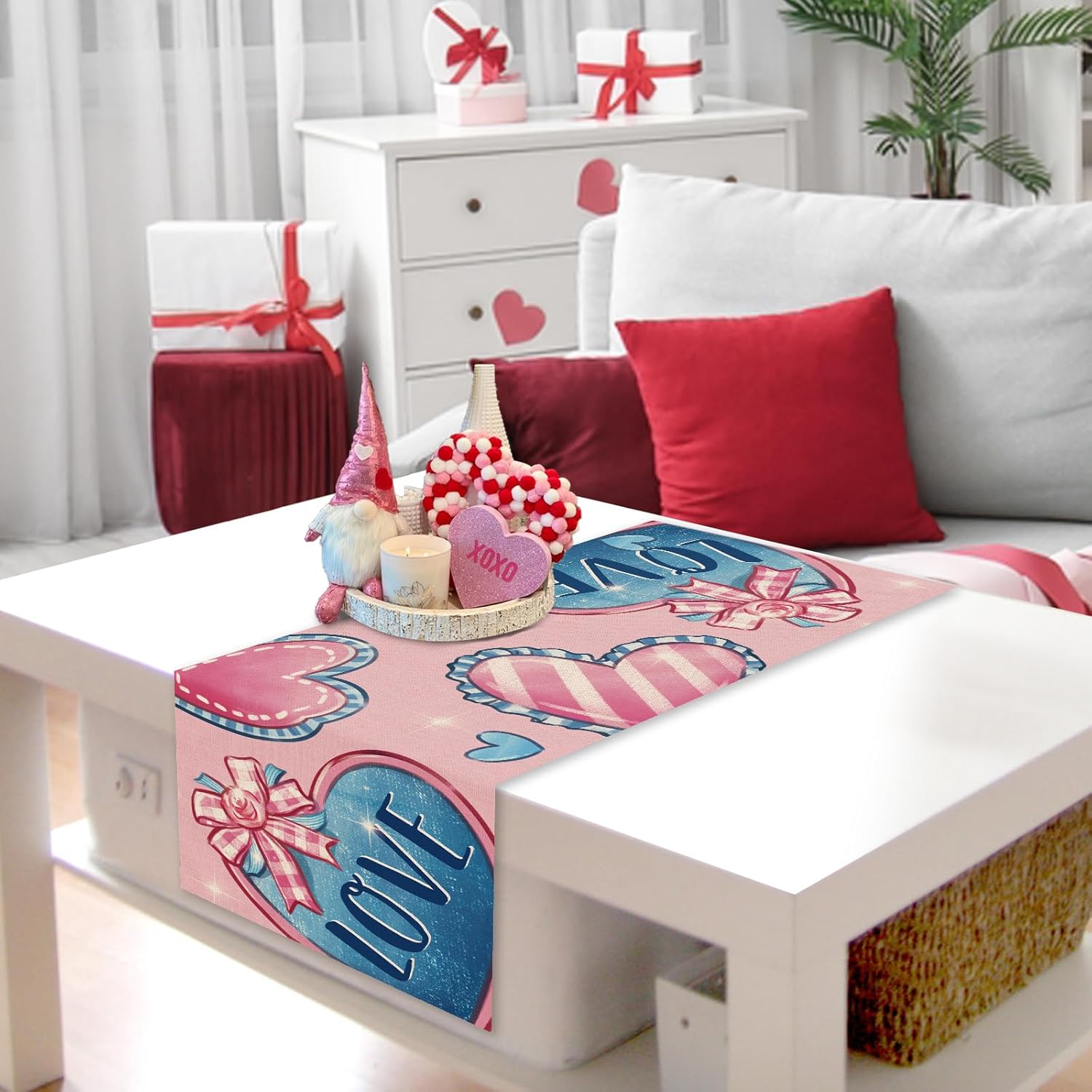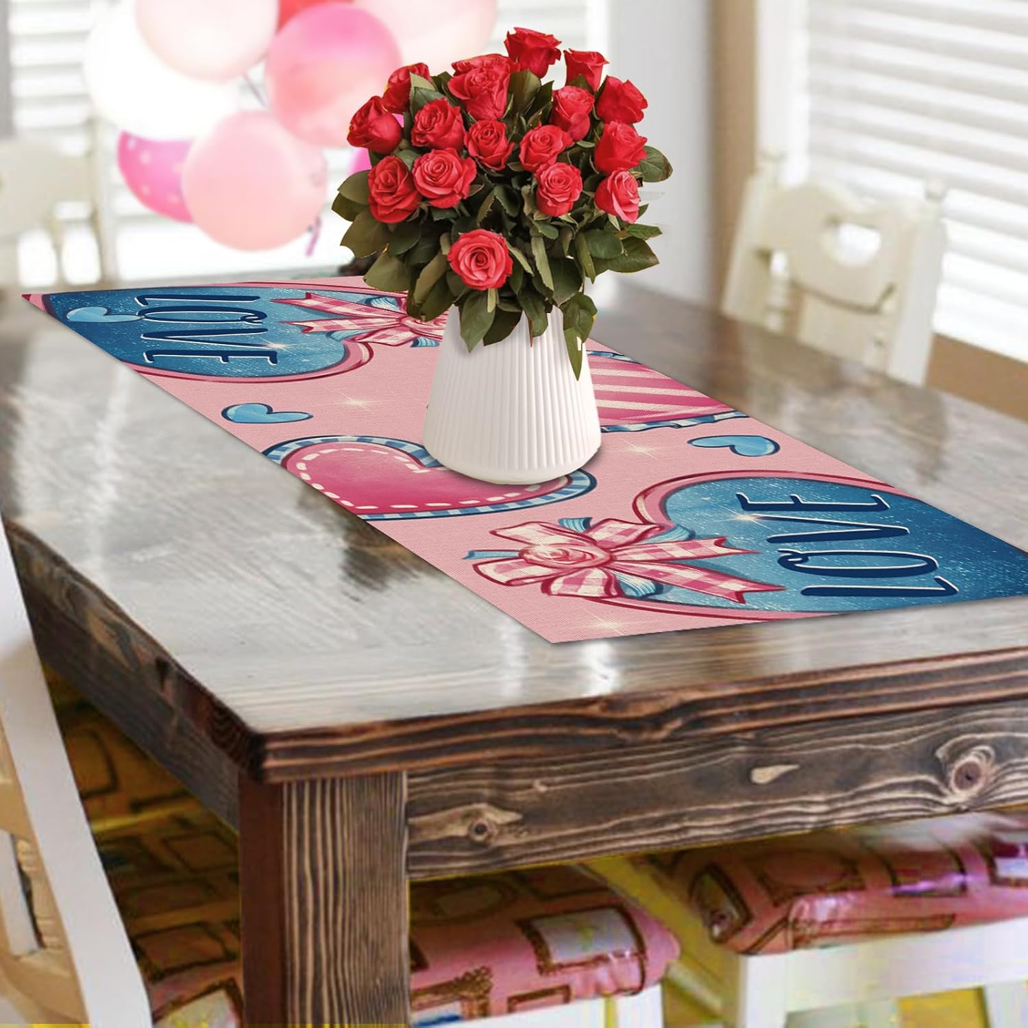 Valentines Day Love Table Runner, Pink Blue Hearts Stripes Kitchen Dining Table Decoration, Anniversary Wedding Burlap Indoor Outdoor Home Decor Party Supply 13 x 36 Inches
