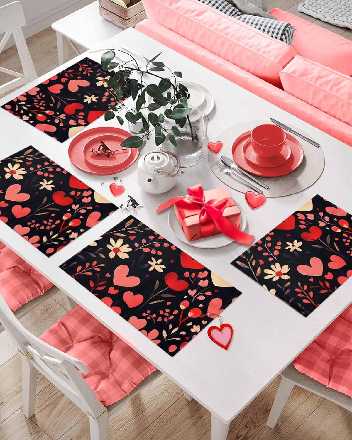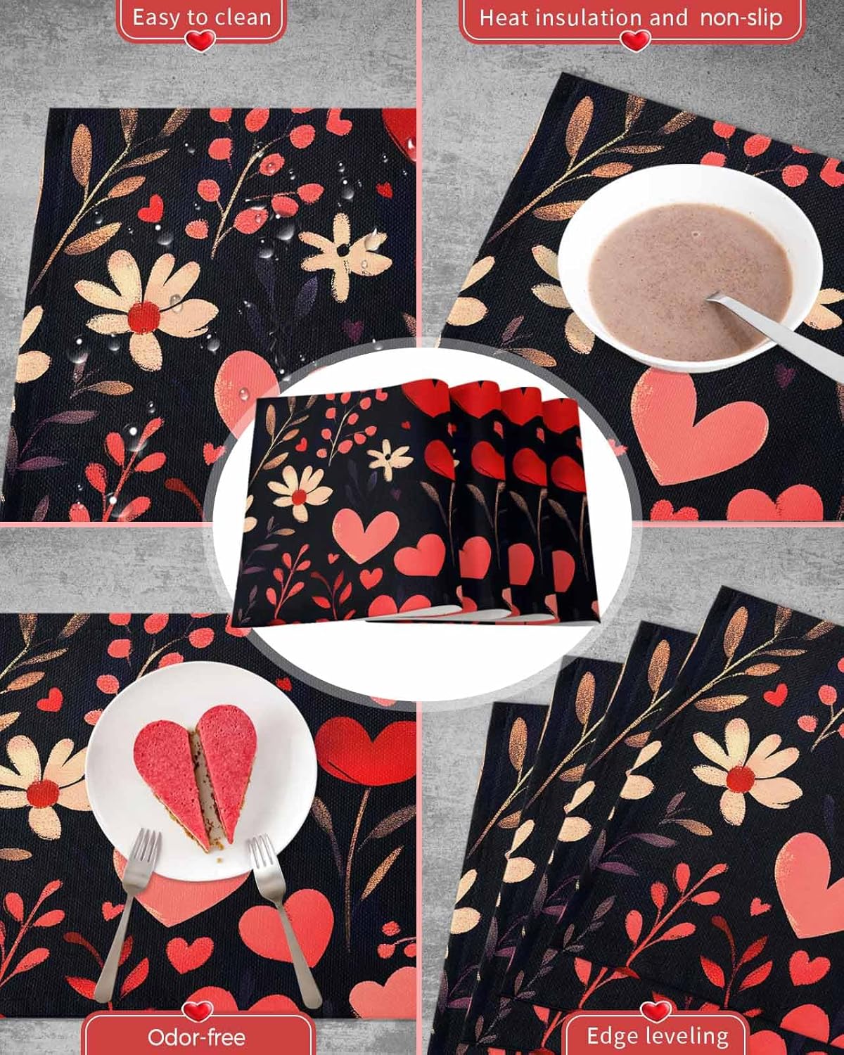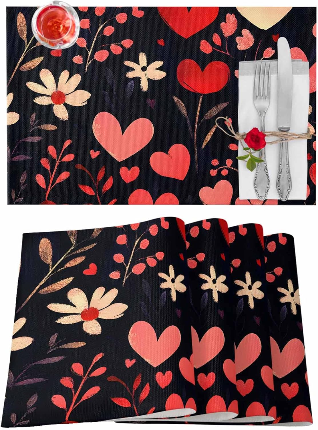 Valentines Placemat Love Heart Place Mats for Dining Room Dinner Table Romantic Flower Leaves Black Valentine’s Day Washable Table Mats Kitchen Decorations Set of 4