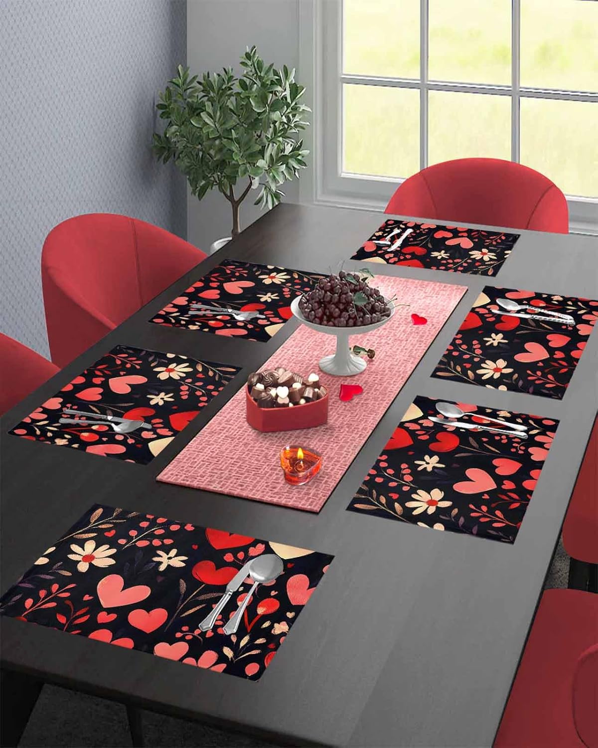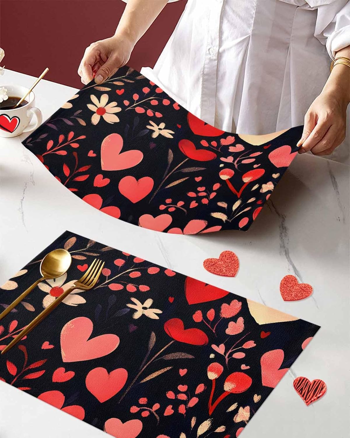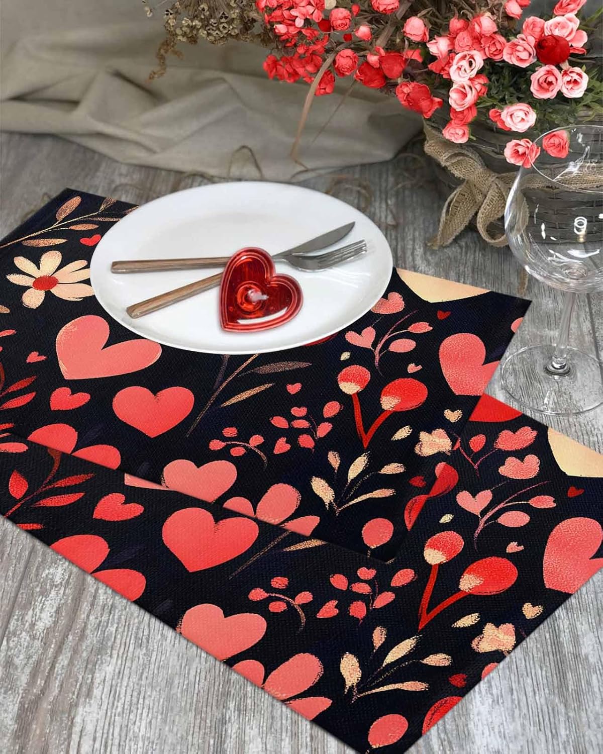 Valentines Placemat Love Heart Place Mats for Dining Room Dinner Table Romantic Flower Leaves Black Valentine’s Day Washable Table Mats Kitchen Decorations Set of 4