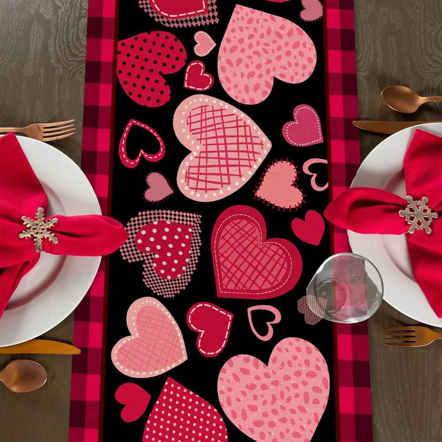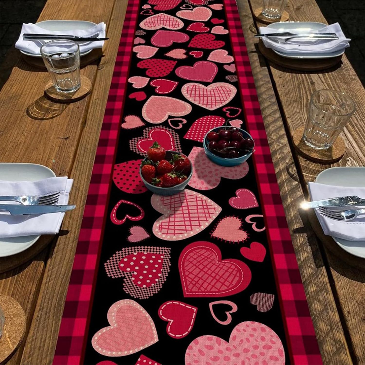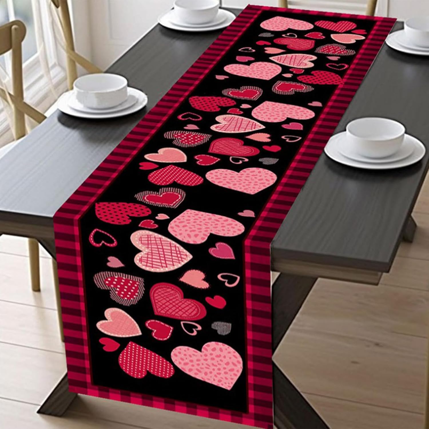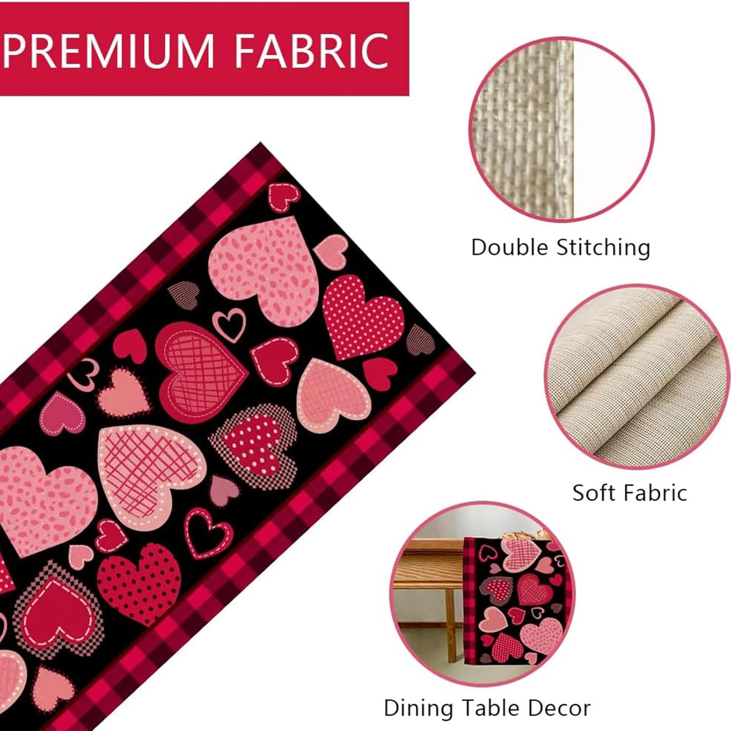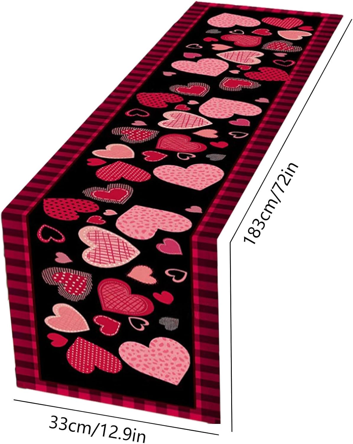 About this itemnPolyestern?Premium Quality Fabric?Valentines Day table runner is crafted from high-quality, durable polyester fabric that is soft and wrinkle-resistant.n?Romantic and Festive Design?Featuring a delightful combination of vibrant red love hearts and a classic buffalo plaid pattern, this table runner brings a cozy and romantic Valentines Day vibe to your home.n?Perfect Dimensions?Measuring 13×72 inches, this table runner is suitable for most standard dining tables seating 4-6 people.n?Versatile Seasonal Decoration?This Valentines Day table runner is ideal for a variety of settings, from casual dinners to special holiday gatherings.n?Easy to Clean and Maintain?Designed for practicality, this table runner is machine washable for effortless cleaning. The vibrant love heart and plaid design stays vivid even after repeated washes.