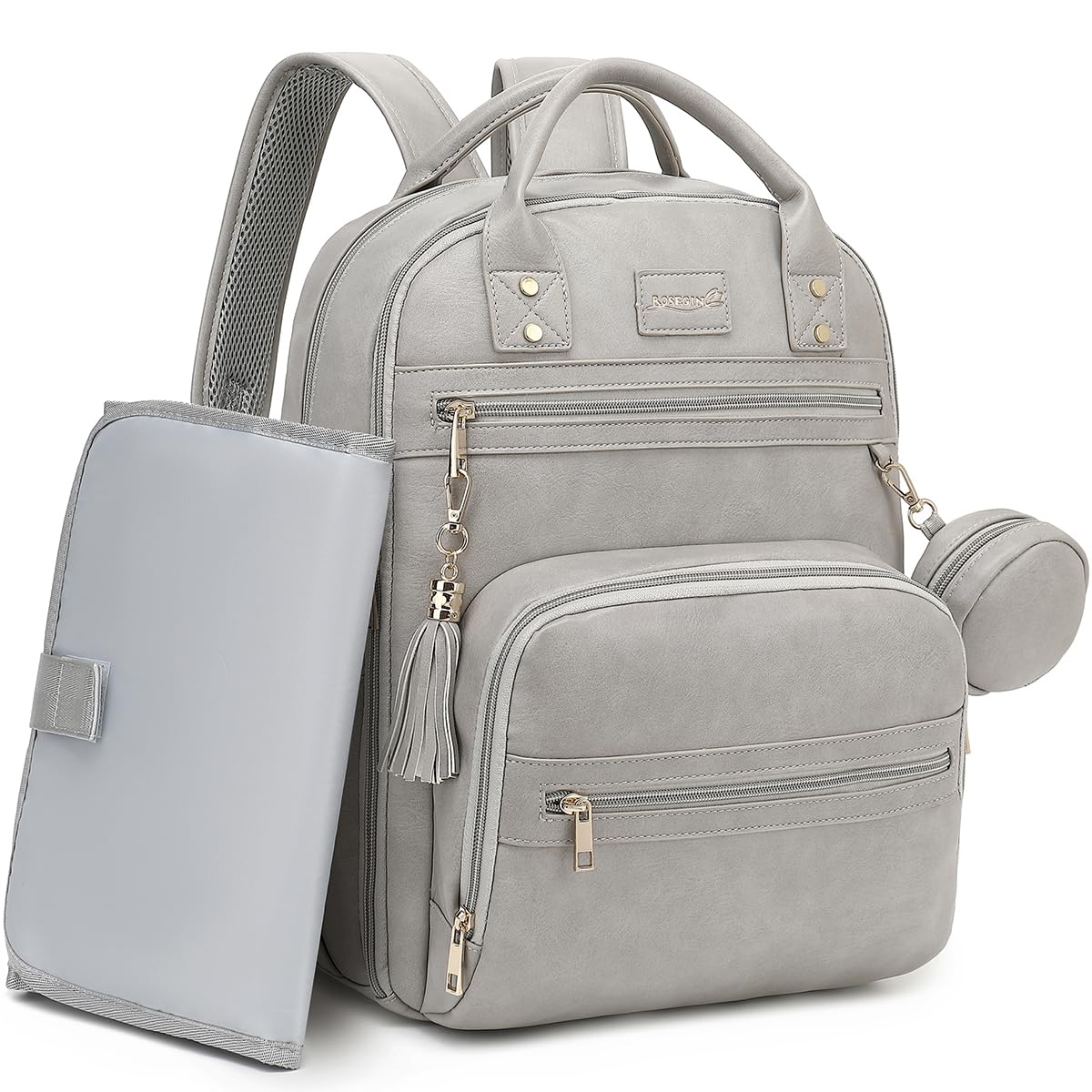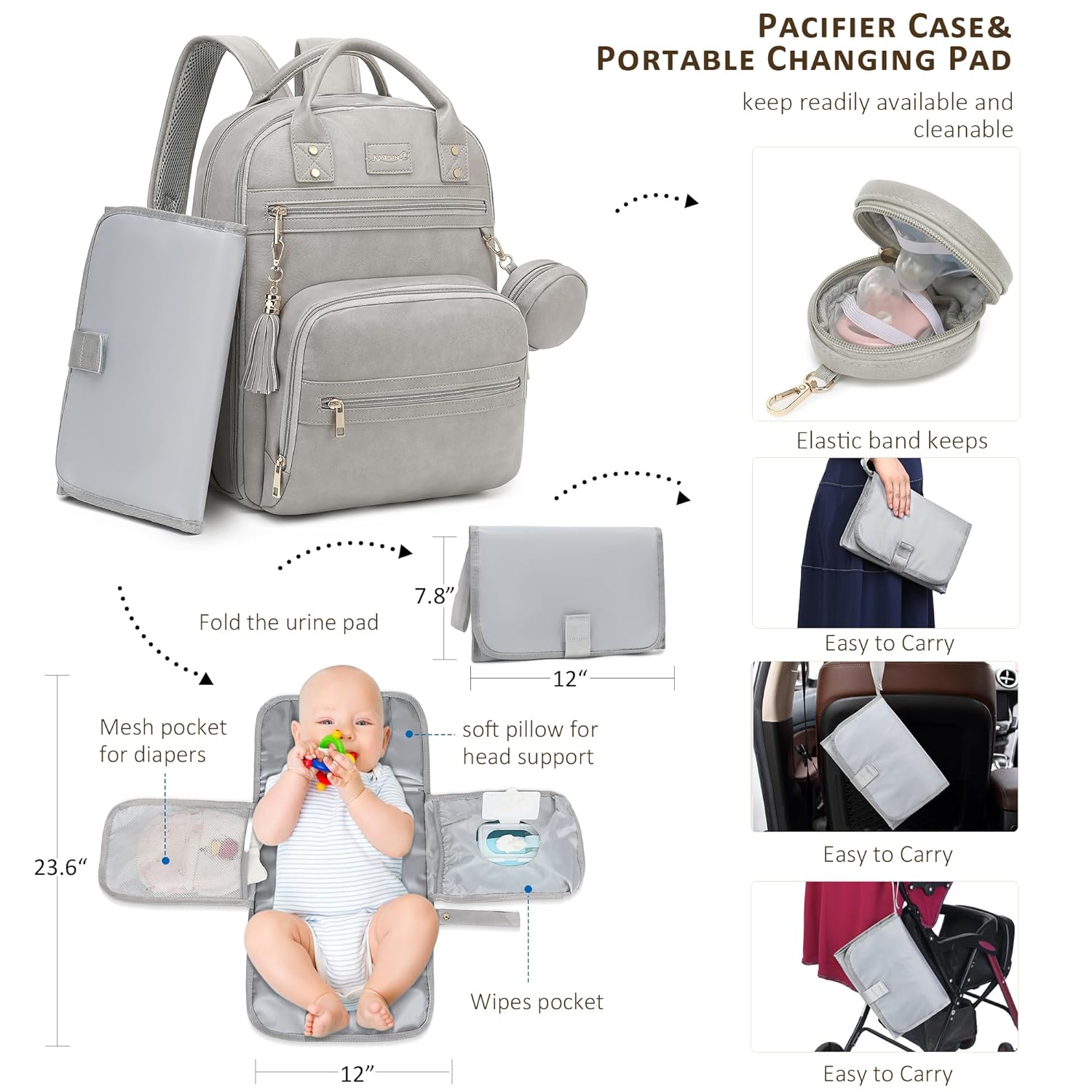 Vegan Leather Diaper Bag Backpack for Boy Girl with Changing Pad and Pacifier Case, Waterproof, Travel Baby Bag Backpack for Mom Dad, Perfect Baby Shower Gifts, Grey