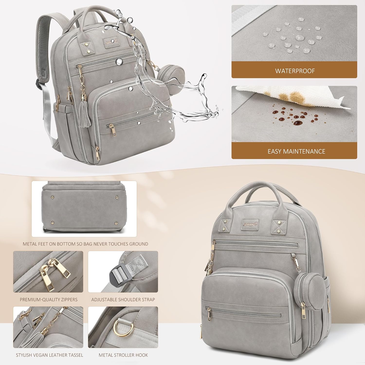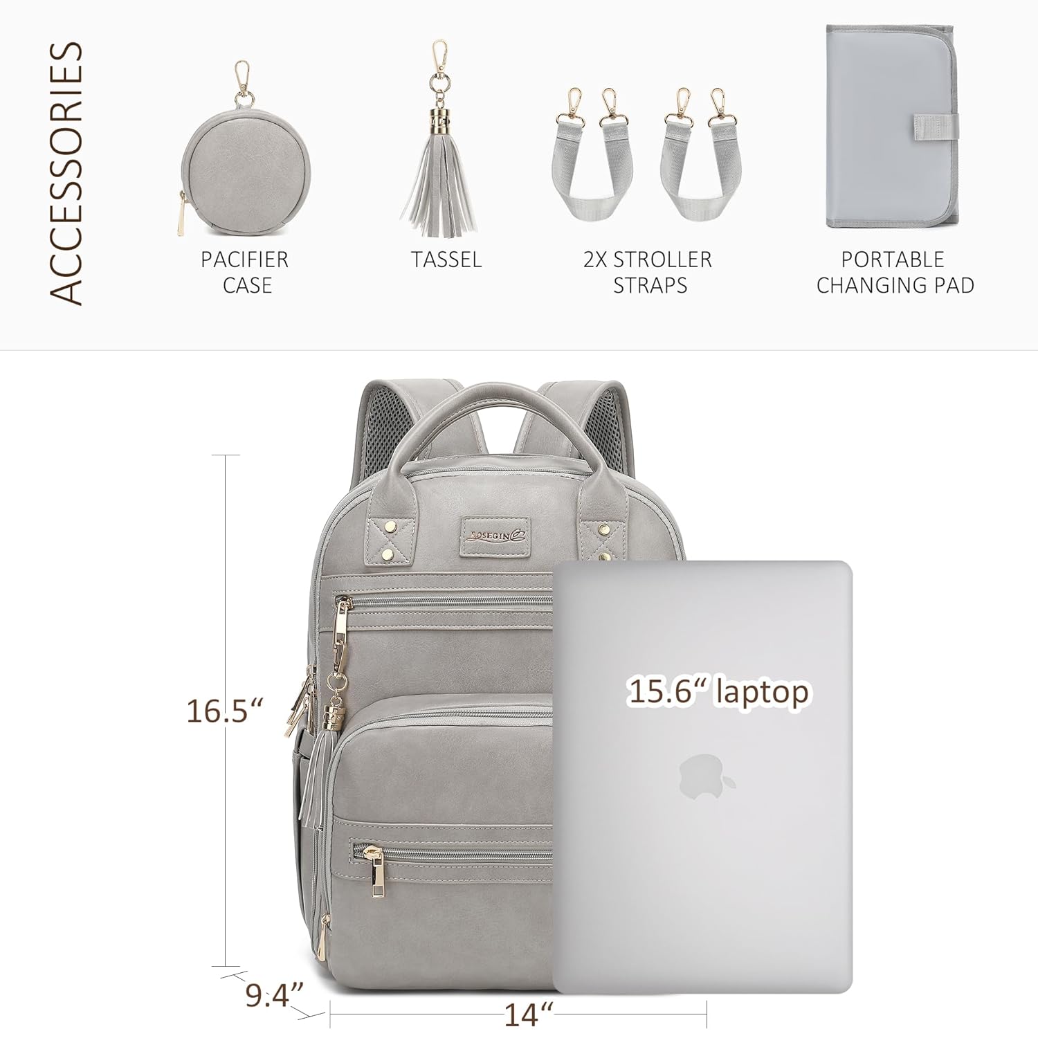 1. Spacious 35L Capacity with Dual Main Compartments Measuring 16.5x 9.4x 14, this leather diaper bag backpack offers 20 pockets, including 2 large main compartments, 3 insulated bottle pockets for all major bottle brands, a dry/wet separation pocket, and a dedicated laptop slot (up to 15.6) for easy organization.n2. Complete Essentials Included Equipped with a foldable waterproof changing pad (23.6x 12), detachable pacifier case, and stroller straps. This diaper backpack is ideal for daily use, work, or travel, making it a perfect baby shower gift or registry item.n3. Durable Vegan Leather for Everyday Use Made from waterproof faux leather, this baby diaper bag is designed for long-lasting use. Reinforced stitching and sturdy zippers offer extra durability, while the easy-to-clean exterior suits the needs of busy parents.n4. Comfortable & Versatile Carrying Designed with padded shoulder straps, a convenient top handle, stroller straps for hands-free convenience, and a back luggage sleeve to slide over suitcase handles. This backpack diaper bag provides comfort and ease, keeping essentials readily accessible for parents on the go.n5. Lifetime Warranty & 24/7 Support Enjoy peace of mind with a lifetime warranty and round-the-clock customer support. Perfect as a baby boy or girl diaper bag, this gift is ideal for Mothers Day, Thanksgiving, Christmas, and beyond, ensuring new parents have a reliable and stylish bag theyll actually use.n See more product details