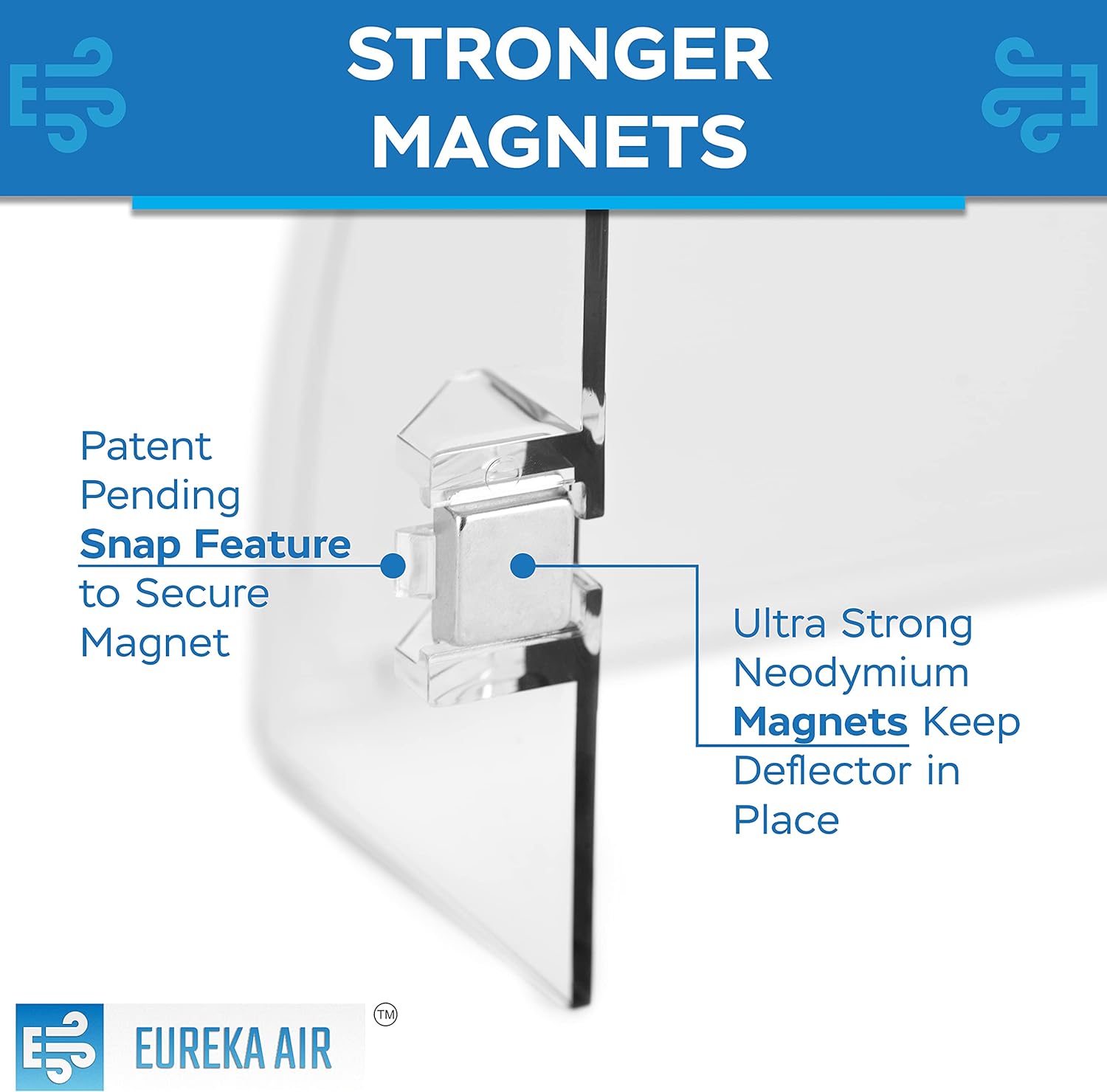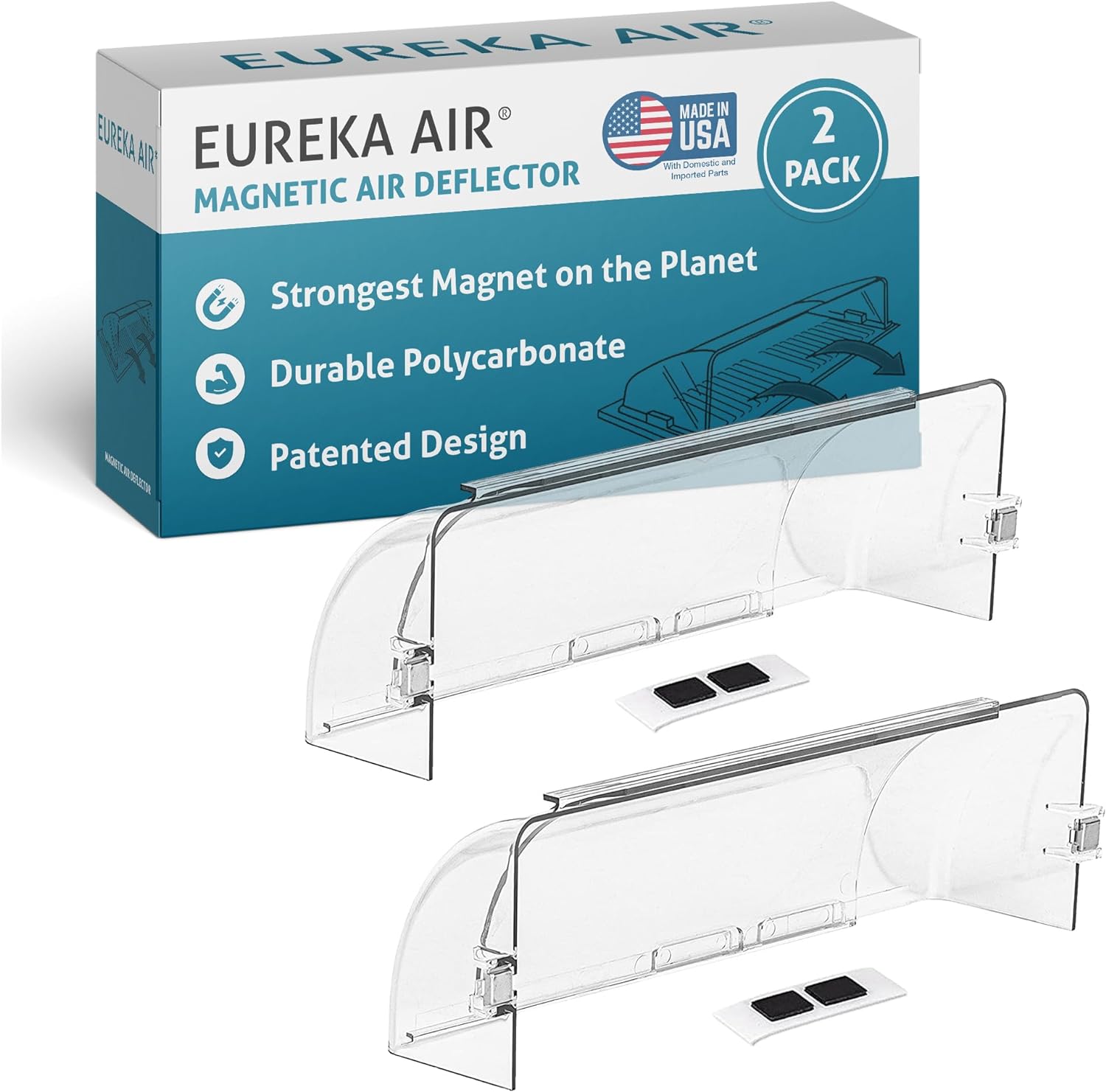 INCREASE COMFORT: Redirects air flow for greater comfort and energy efficiency.nUSE ON ANY REGISTER MATERIAL: Attaches to steel vents with powerful neodymium magnets which snap securely into the deflector using patent pending design. Includes 3M high strength adhesive tabs for nonmagnetic vent surfaces such as aluminum, wood, stainless steel, or brassnADJUSTABLE: Easily adjusts for register sizes 10-14. Stops when extended to maximum of 14 and will not sag or come apart.nHIGH QUALITY: Eureka Air Deflector is made using near lens quality polycarbonate plastic which is precisely engineered and manufactured to insure smooth and stable movement throughout adjustment range.nMADE IN USA: We are a small team of aerospace engineers, who design and manufacture quality products right here in the USA.n See more product details