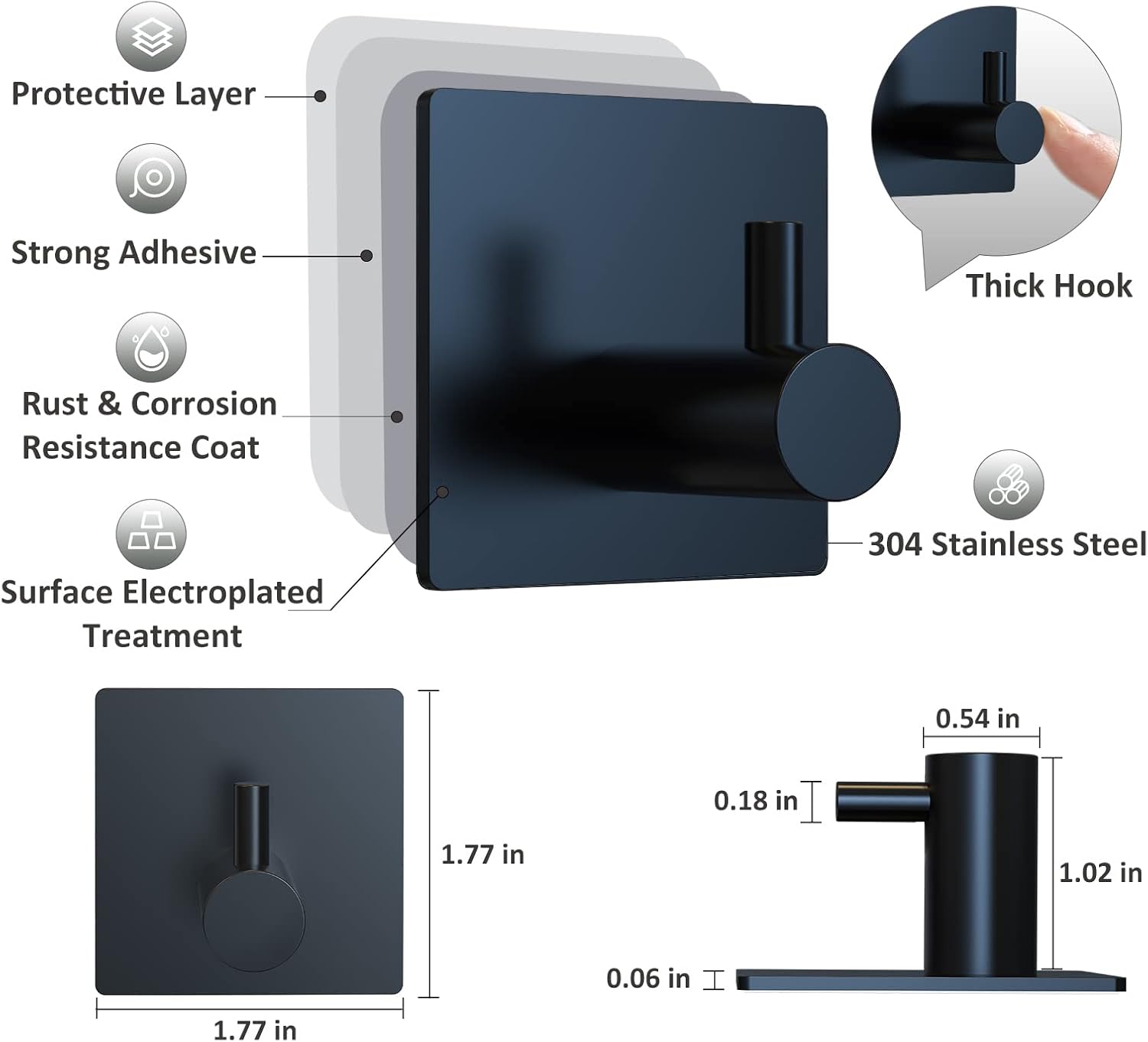 About this itemnWell Made: Adhesive towel hooks are using 304 stainless steel material, smooth edges, sturdy and durable; surface electroplating treatment have excellent waterproof, antirust and scratch resistance; matte black finish, minimal and sleek looking goes well in any decornSimple yet Secure: The hook portion is big and thick, sturdy and not easy to break; short little cylinder at the end effectively protects items from falling off; simple little shower hooks fits into small tight spaces like closet, cabinet, refrigerator, keep it within arms reach or easy accessnHeavy Duty: Stick on hooks has the advantage of strong intial adhesion, adhere immediately and stay put firmly; small but mighty can holds up to 16 lbs; versatile to hold household things, decorations and all sorts of items, very functional and stylish accessory for any homenSimple Installation: No drilling or tools required; make sure the surface is clean and smooth, easy to install just peel and stick the wall hooks to the desired position; convenient and effective, really solved home storage space issuenWildly Use: Peel and stick hooks has a decent look, can securely sticks on tile, marble, metal, glass or other smooth surfaces; nice addition to bathroom, laundry, kitchen, camper, RV, trailer, office, school, hotel for a variety of purposen See more product details