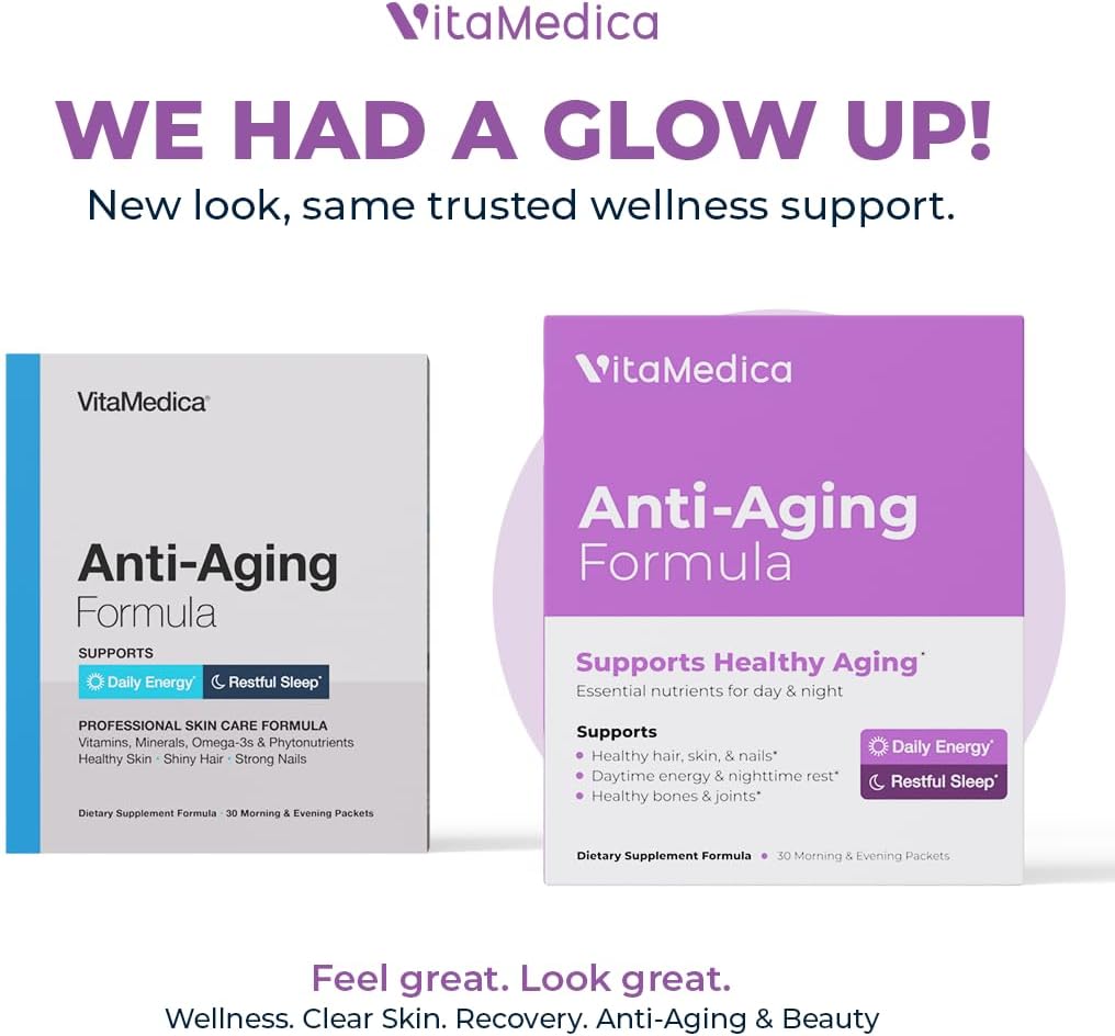 VitaMedica Anti-Aging Formula 4-in-1 Health and Beauty Supplement | Anti Aging Supplement for Women and Men | Healthy Hair, Skin, and Nails | Natural Energy & Restful Sleep | 30 AM & PM Packets