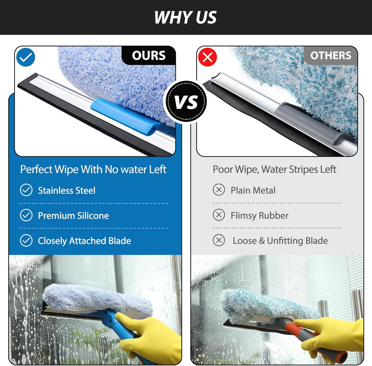 About this itemnWINDOW SQUEEGEE CLEANING KIT: This 69 inch multi-purpose window squeegee kit has 3 different head options to deal with diverse cleaning needs: a 10 squeegee blade, a chenille scrubber, a microfiber scrubber, along with a rotatable attachment. Various combinations of the cleaner with the adjustable attachment make cleaning easy and efficient.nLONG-REACH OR HANDHELD: The pole included is designed in a detachable way that if needed, can be quickly assembled into a long, handy extension pole total height up to 69 inches. Compared with other aluminum-poles on the market that bend easily, we use high-quality iron for better quality and make sure that it lasts for a long time. It can also be handheld with the cleaning head only.nQUALITY SQUEEGEE FOR RESULT: The squeegee in the package delivers high quality in both materials and produce. The whole metal part is made of high-quality stainless steel, is rustproof, anti-corrosion, and much sturdier even with hard scrubbing. The SILICONE BLADE fits tightly to the metal part and does not swing as loosely as others. This blade makes it less likely to leave water streaks.nCHENILLIE & MICROFIBER SCRUBBERS: 2 types of scrubber sleeves satisfy various maintenance such as cleaning dust and wiping glasses. These 2 materials are super-absorbent and they transfer a decent amount of water and soap-suds to glass surfaces, and they scrub away moisture, dirt, grit, and grime, finishing with sparkling-clean windows. Both scrubbers are washing-machine safe.nFUNCTIONAL & VERSATILE: With a combination of different scrubbers and blade, this window squeegee cleaning kit is a necessity in household cleaning. It makes cleaning everywhere easy, including both indoor and outdoor, high and low; no more dangerously stepping on a ladder to reach for cleaning. Effortlessly clean up areas and surfaces such as car, bathroom door, indoor and outdoor windows, French window, wide windshield, balcony glass, mirror, office glass wall, camper.
