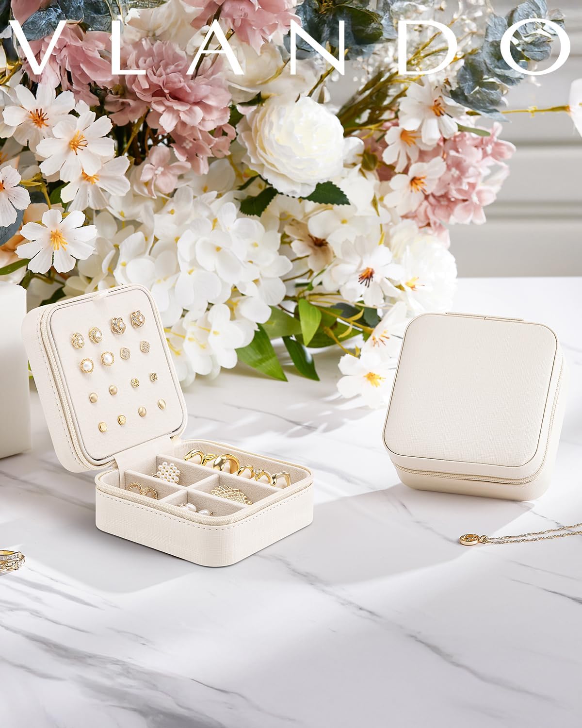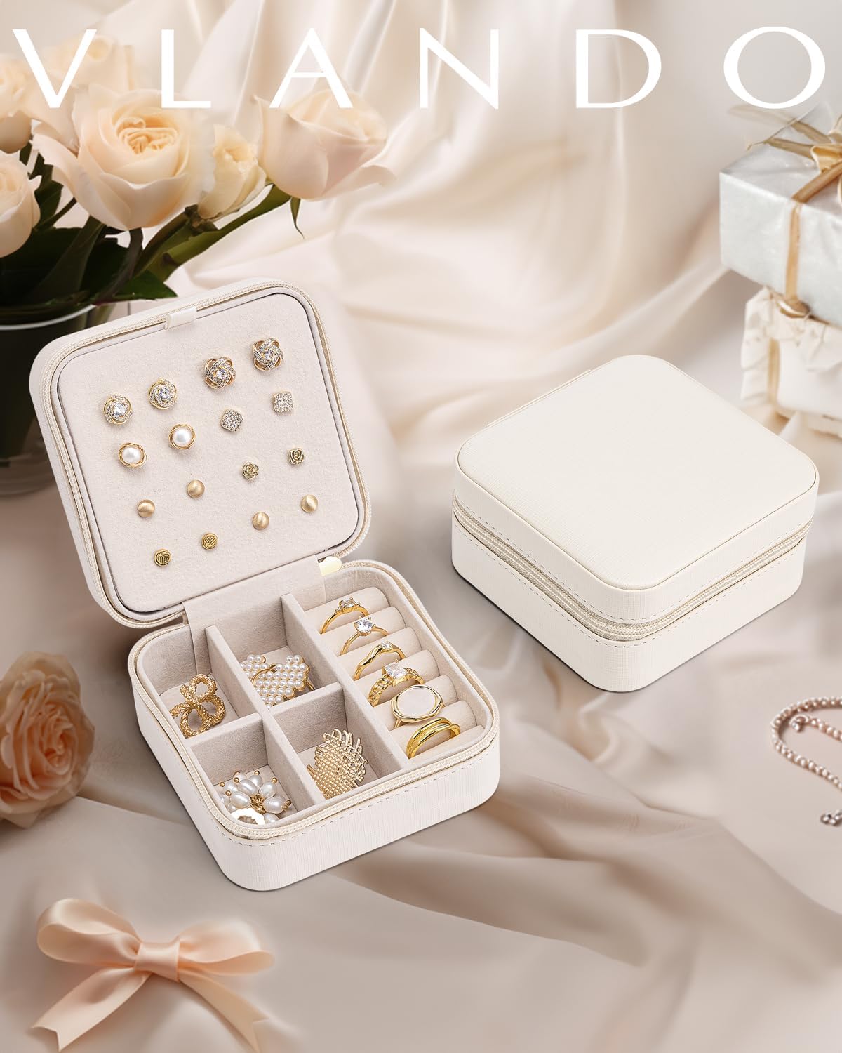 About this itemnQUALITY MATERIAL – Premium waterproof PU leather + High Quality flannel interior + Removable dividernMINI SIZE – 3.9*3.9*2inch/10*10*5cm, Travel jewelry case is portable and light weight, easy to carry in your handbags or in your luggagenSIMPLE DESIGN – Vlando jewelry storage box has a simple and compact design, elegant appearance, and two removable dividers to meet different needs. It can accommodate at least 8 pairs of earrings, suitable for travel storagenIDEAL for STORING Jewelry, bracelets, earrings, rings, necklace, and other precious keepsakes. Jewelry stop tangling in a bagnAS a GREAT GIFT – Perfect for Valentine’s Day, Birthday, Mother’s day, Christmas, Thanksgiving Day and Wedding Gifts for girls & womenn See more product details