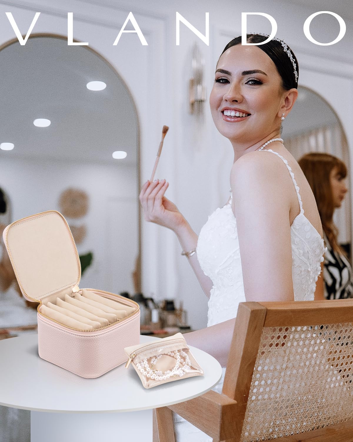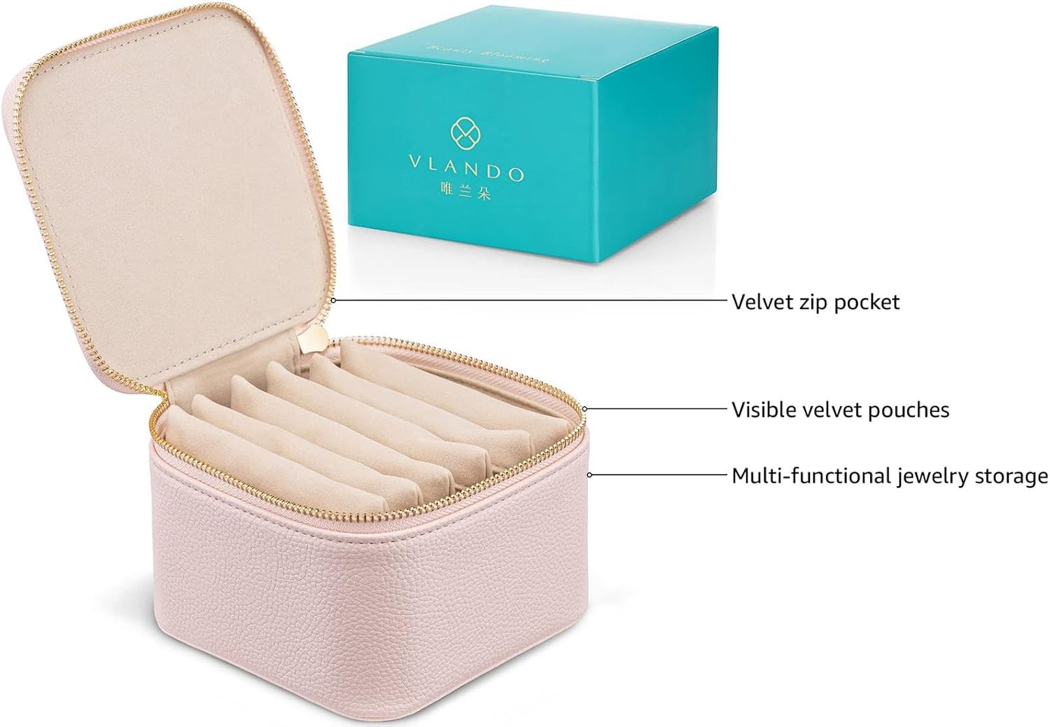 Vlando Travel Jewelry Case,Jewelry Organizer with 6 zipper velvet Jewelry bags for Women Girl,Wedding Birthday Gift Ideas for Women Earrings Rings Storage Gift Box Packaging Pink