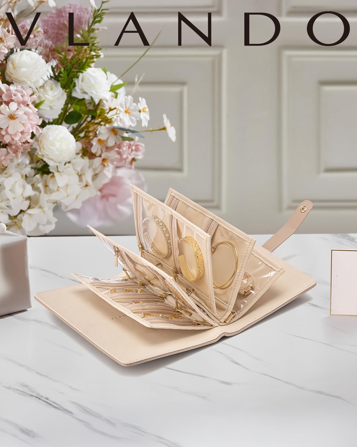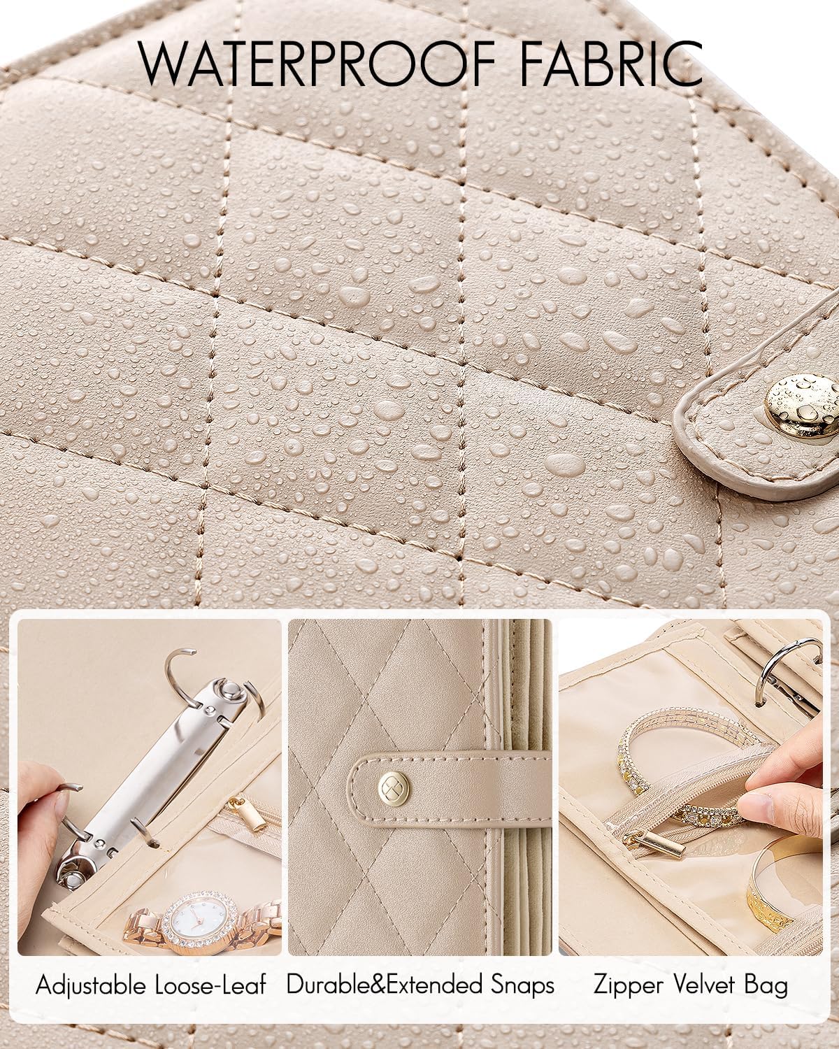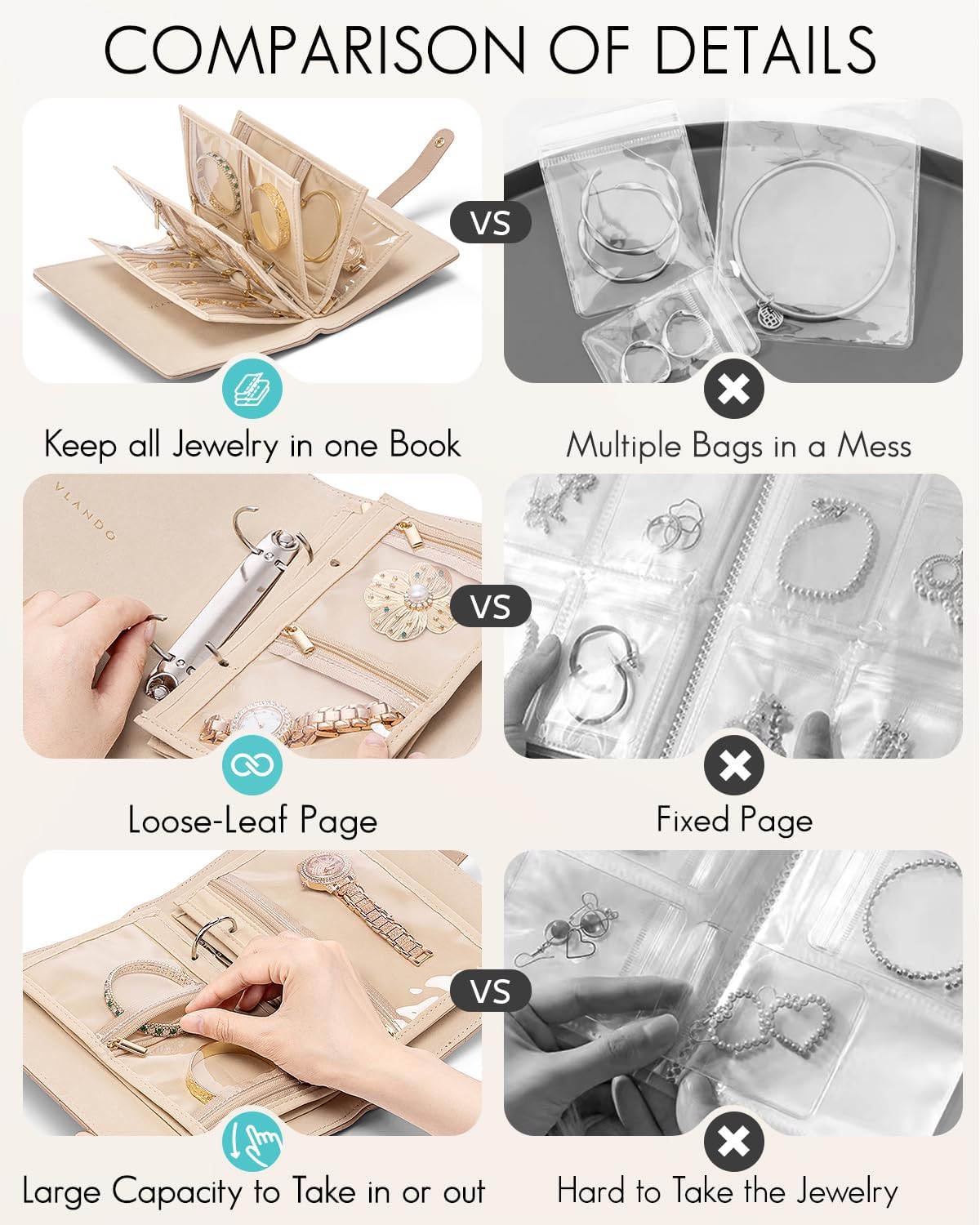 About this itemnPortable Travel Jewelry Organizer: 6.8×1.7×8.6 inches?Organize your traveling essentials orderly into a book easy to carry in your bag or suitcase.Perfect for travel or daily outgoingnPartitions Storage: Vlando jewelry case have 5 loose-leaf pages with metal binder rings(include 1 Page for large gird+ 2 Pages for medium grids +3 Pages for small grids ),can accommodate various types jewelry. Enough for your 5-7 days traveling or daily usenWaterproof Travel Jewelry Organizer: Foldable jewelry storage book quilted soft material can protect jewelry from getting squished and scratch. Zipper vevlet pockets protect your jewelry from falling out, lost, oxidation, dust and damagenAdjustable Ring Binder?Women’s travel jewelry organizer comes with metal binder rings,you can add or remove pages flexibly as your needs. Tips: If you want to put some chunky jewelry, suggest reduce some inner pages appropriately to avoid squeezing your jewelrynPerfect Gift: Exquisite Jewelry Case with velvet pouch bag,each woman’s ideal jewelry organizer,which is suitable for necklaces, rings, bracelets, watches,photos, tickets, receipts, cards or other traveling essentials. Sweet Gifts for Wedding,Birthday,Anniversary,Valentine’s Day