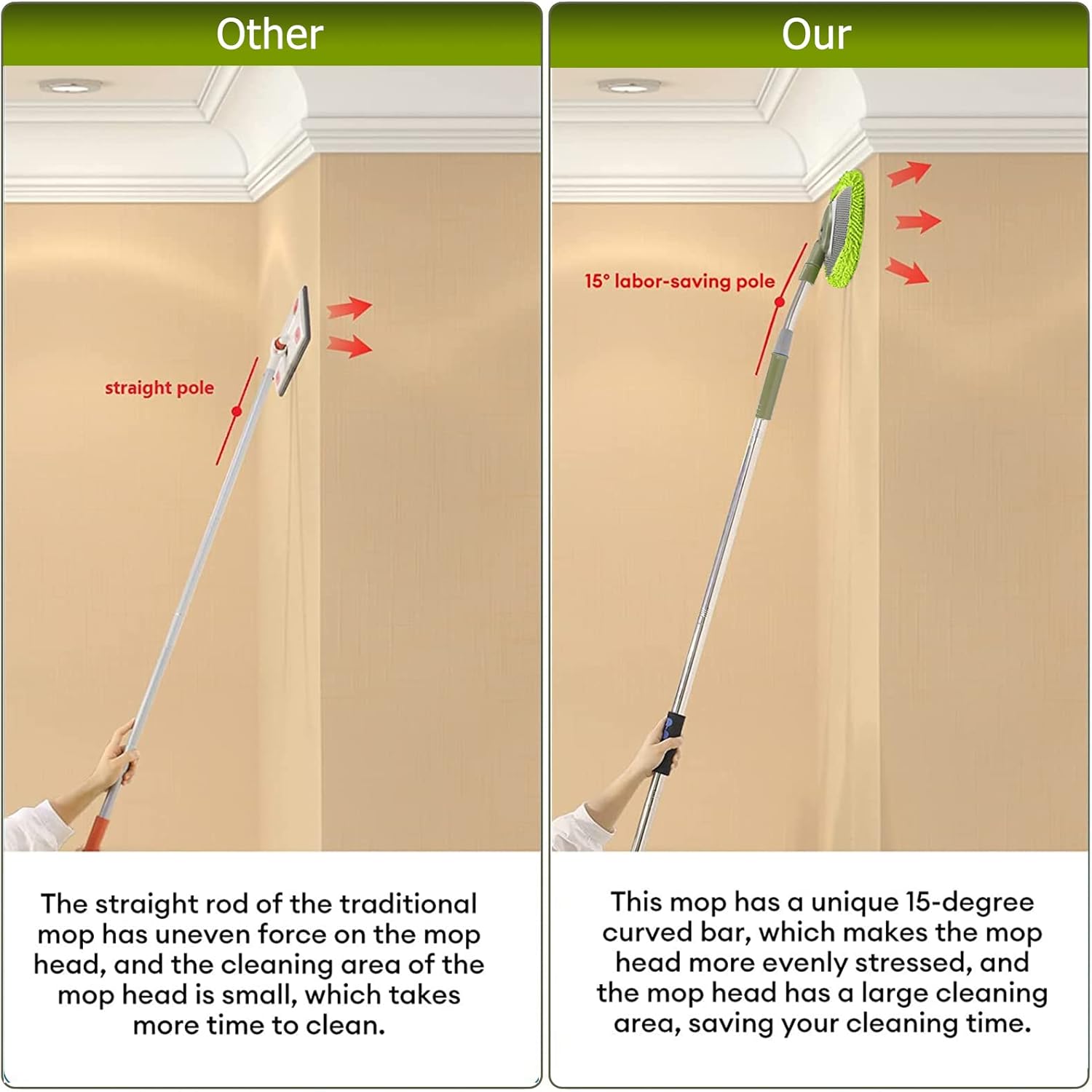 About this itemnERGONOMIC EVA ANTI-SKID SPONGE HANDLE: The sponge handle of this wall mop is made of high-quality eco-friendly eva material, matte textured surface, with good anti-slip effect, soft and high elasticity, ergonomic design, provide you with a more comfortable grip.nCHENILLE MICROFIBER WASH BRUSH HEAD: Finer chenille microfiber has stronger decontamination ability, can easily remove dust, and is easy to clean crevices and baseboards. The mop head is soft, lint-free and scratch free, and can be used safely on smooth walls and other smooth surfaces. Not suitable for knock down textured and frosted walls. With extremely strong water absorption and release, it can quickly absorb water and start your cleaning work, just need to gently twist, it can quickly dry.n66” STAINLESS STEEL SCREW TOGETHER WAND: 15°ergonomic labor-saving Elbow reduces the user’s height requirements, and can easily clean the roof, tall cabinets and other higher places to clean. The use of ultra-light stainless steel material makes lifting more effortless and easier to use. Adjustable height design to meet your requirements for different heights, avoid stretching, bending or twisting to complete everything. The 105°clean wide angle makes your cleaning process easier and faster.nWIDE SCOPE OF APPLICATION: Eco-friendly and reusable household cleaning tools. It can be used wet or dry. Can clean baseboards, tall windows, bathroom wall, tall cabinets, walls, ceilings, floors, dust and cobwebs. It is the ideal cleaning helper for your home.nWHAT YOU WILL GET: wall mop x 1, replaceable mop head x 2, slide-in elastic cord replacement head for easier brush head replacement and cleaning. The mop head is machine washable.