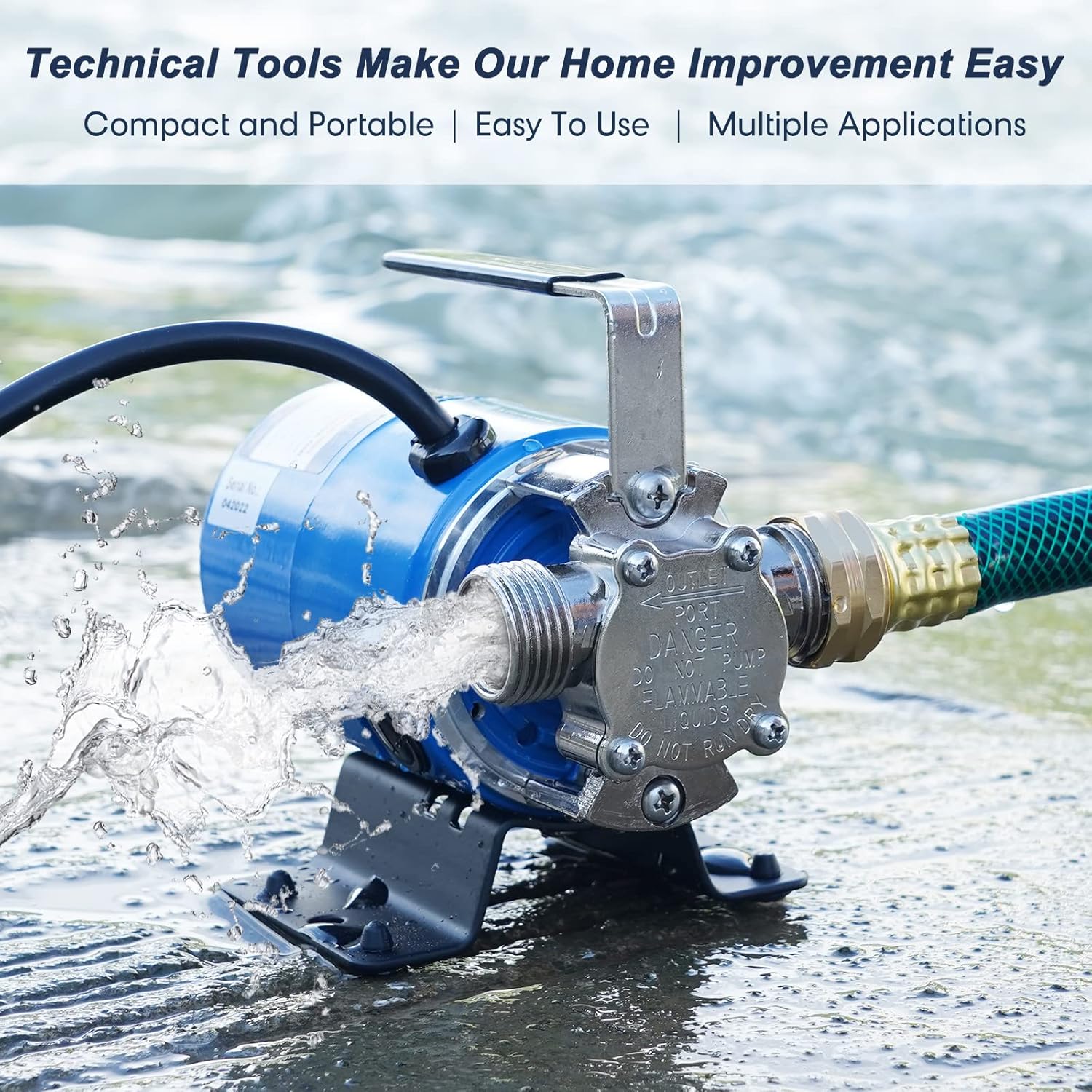 About this itemn?Electric Water Pump?Volts/Frequency?115V/60 HZ; Power?1/10 HP; Max.Flow Rate?330 GPH; Discharge:3/4 in.GHT; Max.Suction Lift?6 ft; Max.Discharge Head?40 ft; Discharge Port?3/4 Inch; Suction Port?3/4 Inch. This is non submersible transfer pump, so do not get the motor wet.n?Easy to Use and Carry?Fill the water in the pump head, connect the hose, plug it in, and start pumping. This hose pump is a lightweight and portable water pump with a portable handle making it easy to carry.n?Low Suction Function?This hose pump includes 6 ft suction hose and water suction strainer attachment as well as an additional impeller replacement kit. If use water suction attachment, this water pump with hose can remove water down to 1/8 inch of surface.n?Multiple Applications?This rain barrel pump waterbed pump works efficiently for removing water from aquariums?flooded basements, rain barrel, water beds and swimming pools. And it can also be used for watering lawns and gardens, washing machines, washing cars or other water requirements in your house.nThis electric water pump transfer pump is made of durable material with metal hose connectors for higher reliability than plastic threads and all water transfer pumps have been 100% factory tested.n See more product details