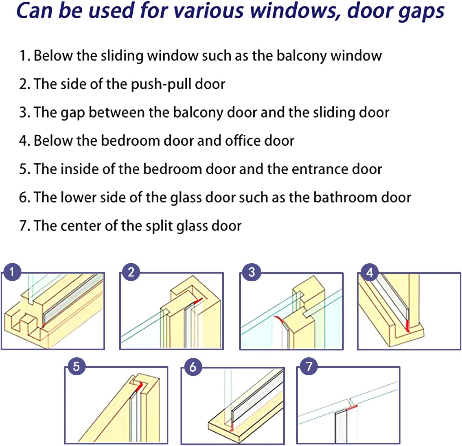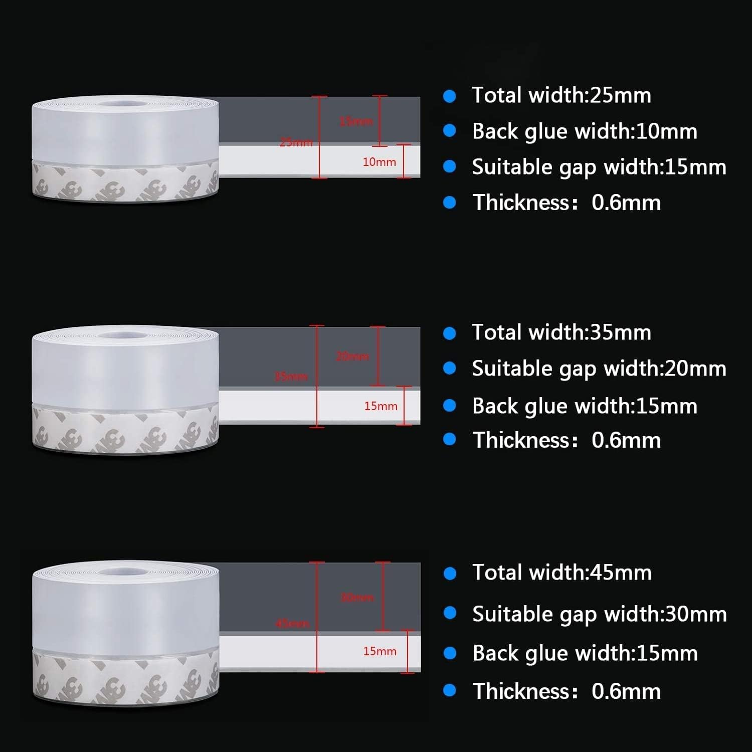 About this itemn?Width Selection?The total length of the sealing strip is 33 feet, thickness of 0.02 inch and can be cut to your needs. A gap of 0-15mm is recommended to select a 25mm width seal; a 0-20mm gap is recommended to select a 35mm width seal; a 0-30mm gap is recommended to select a 45mm width seal.n?Precautions for Use?1. Before using the tape, you should ensure that the surface to be pasted is smooth, clean and dry. 2. In the low temperature environment, it is recommended to heat up the sticky side of the tape with the hair dryers before using the tape.n?High Quality? Made of high quality silicone, it is excellent Flexibility, high Resilience and super Durable. Non-toxic and environmental, it is great for family use. The tape uses high quality glue for long lasting adhesion.n?Wide Application? The weather stripping can be used in the bottom of sliding window/door, plastic-steel windows, security door, closet door,threshold, shower room and etc.n?Multi-Function? Stop the heat and cold from escaping during winter and summer, makes heating and cooling your home or office more efficient. It also help your house away noise, wind, dust, insect, and etc.n› See more product details