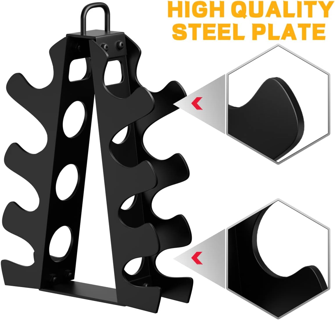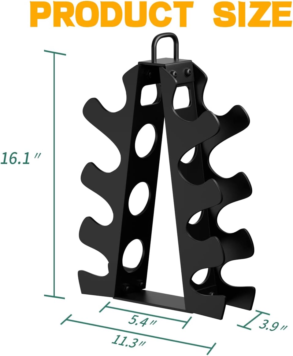 About this itemn???No More Tripping Over Scattered Dumbbells?No matter if youre for a full body workout or weightlifting, we all know the hassle of not having enough room to work out hard. This A frame weight rack for home gym will keep your weights organized and accessible.n???Upgraded Dumbbell Rack with Handle?Upgraded dumbbell rack with handle, simply move or carry even for children, you’ll find it’s much easier to power through exercise after exercise when your dumbbells are easy to access.n???Stable Triangular Design?This dumbbell rack stand only uses a stable triangular design, which is made of 2mm commercial-grade steel, fitted with widen base, making it extremely stable and durable; It can hold up to 80 pounds and does not wobble when taking in or taking out dumbbells; The dumbbell rack is suitable for 5-15 pound dumbbells (weight not included )n???Save Your Limited Floor Space?Dumbbell rack 11.3*3.9*16.1 inches (L*W*H). , net weight 4.5 pounds. This is a compact and small design that can be placed in a corner or next to a sofa to save space. A tidy and safe home gym for you.n???Quick Assembly & Worry-free purchasing Experience?Come with installation tools, the dumbbell stand is easy to install and can be set up in 10 minutes; we provide a 1-month return and exchange service, and a 1-year warranty service. If you have any questions, please contact us. PS: 480LBS Dumbbell Rack not suitable for Peloton dumbbells.