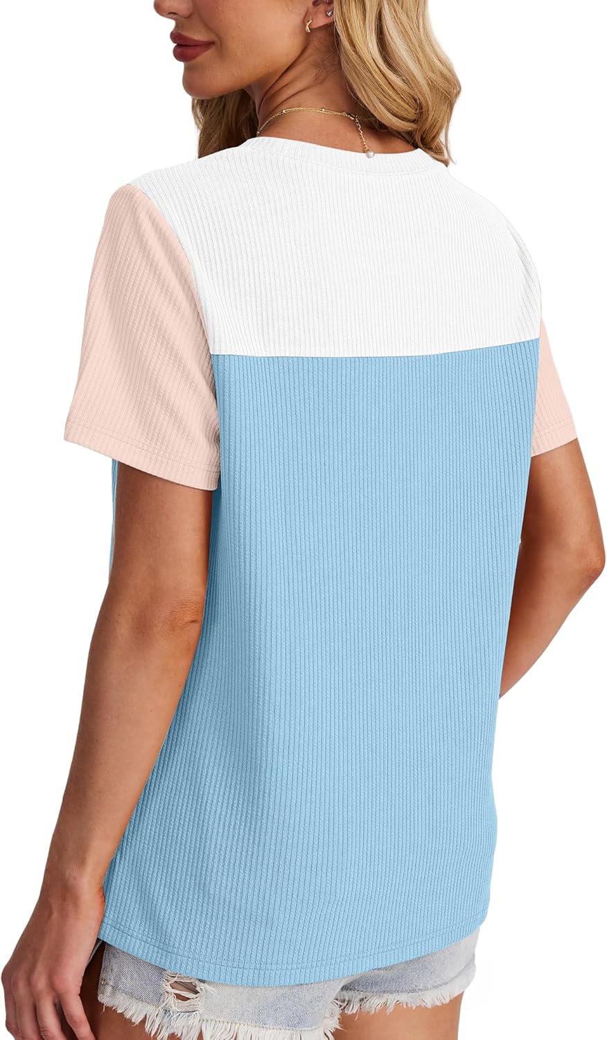 WIHOLL Womens Fashion 2025 Color Block Shirts Short Sleeve Crewneck Knitted Spring Summer Tops Casual Trendy