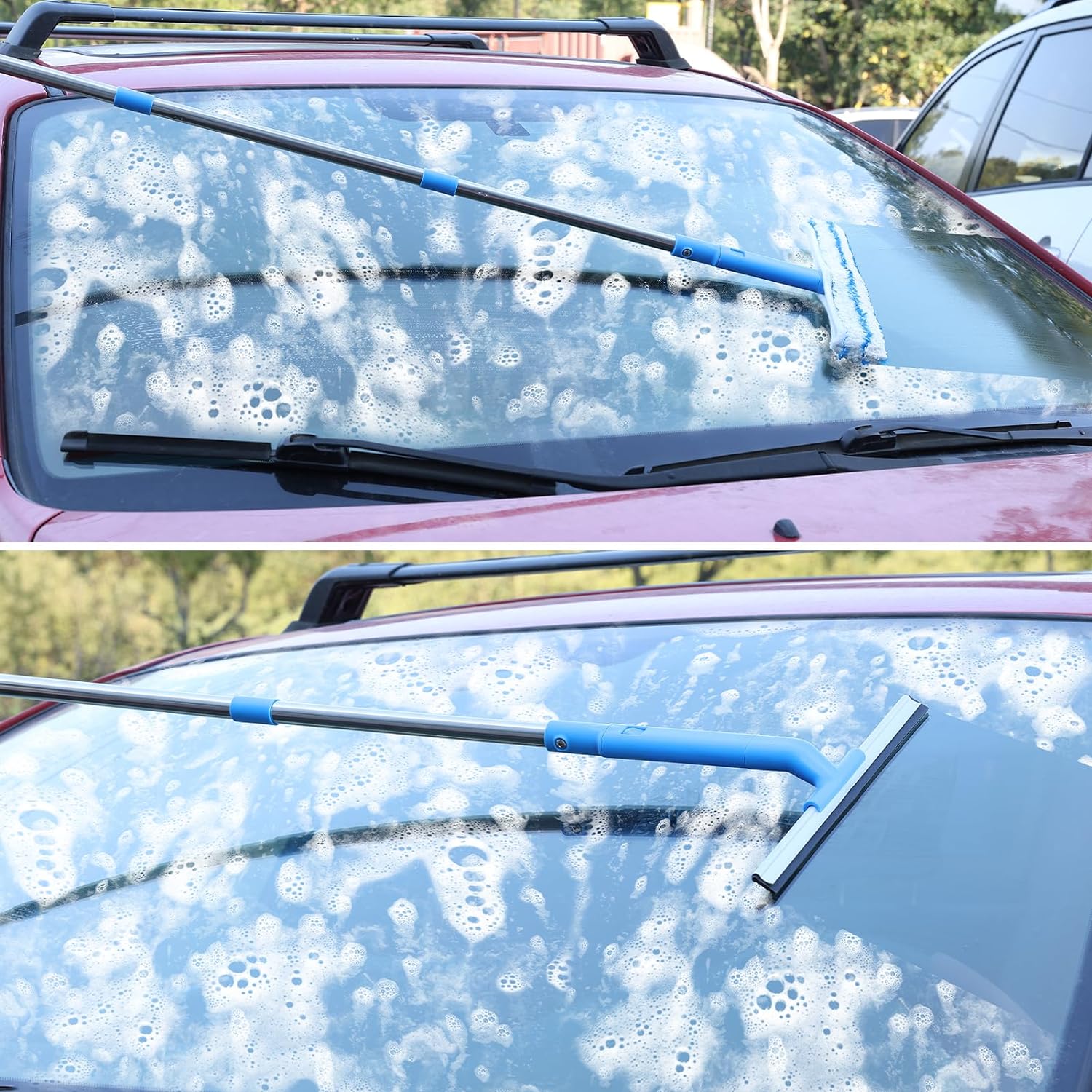 About this itemnWindow Washer Combo: The window squeegee + microfiber scrubber + long handle is the perfect window cleaner tool to efficiently wash and clean your high and low windows. A must-have squeegee for home window cleaning.nSilicon Squeegee Blade: Made of natural silicone, width 12IN, soft and firm, which can better remove water and soap marks on the windows without damaging the glass surface.nMicrofiber Window Scrubber: With a better water absorbing effect, it is easy to mop and remove tough dirt and grime. Comes with 1 extra cloth, its easy to replace and washable by machine.nTelescopic Handle: The high quality stainless steel pole could be extended to 57” in length, suitable to hold for high places cleaning beyond normal reach. And easy to extend the pole with simple twist-and-lock mechanism.nMulti-function: With the squeegee kit and microfiber washer, this window cleaning kit can clean low places, such as shower mirror door. Attached with extension poles, it can allow you to clean high windows and car windshield.