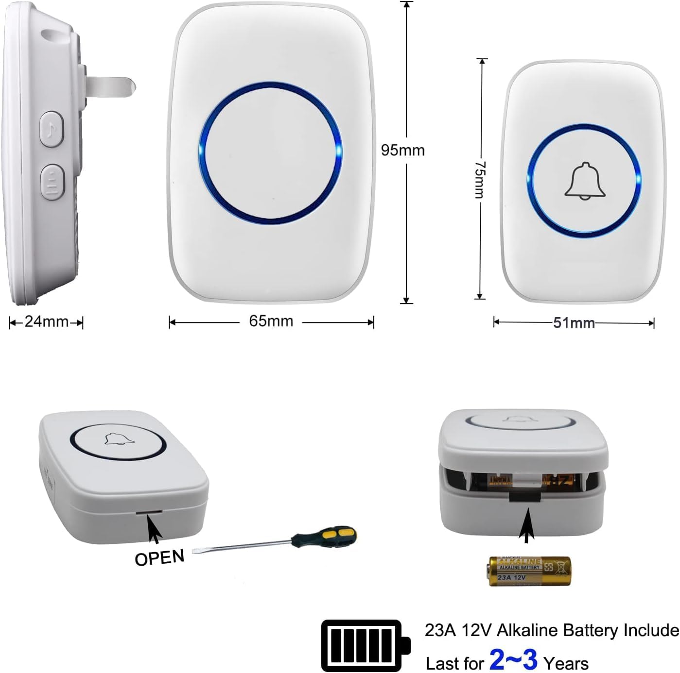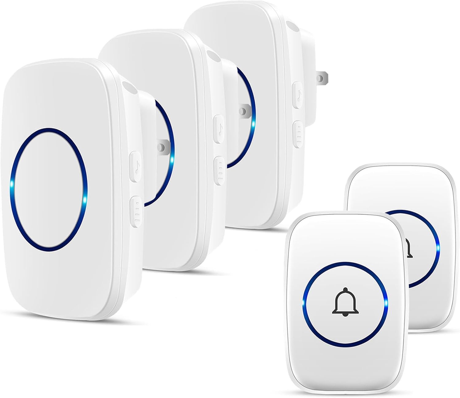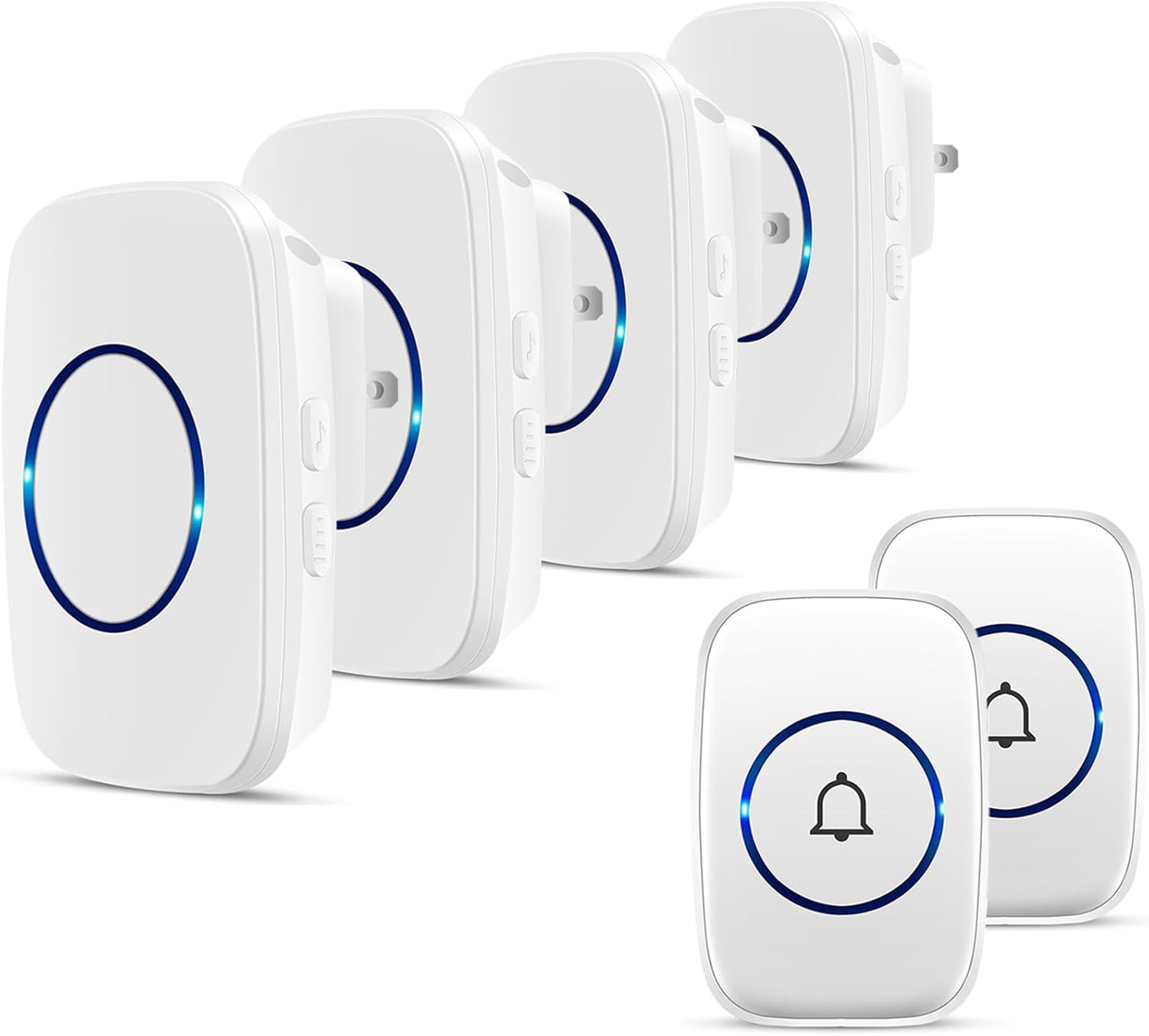 ?Longer Range – Up to 1000 Feet (300m) in the open air from the transmitter (150m if there are walls). Either you are occupied in the bedroom or at the kitchen, our wireless doorbell kit can remind you that someone is calling from outside. Never worry about missing visitors.n?60 Melodies & 5 Levels Volume – The wireless doorbell offers a wide selection of 60 tunes for your choice. 5-level of volume range from 0dB to 110dB. Silent mode with just LED flash is available when you don’t want to be disturbed.n?IP44 Waterproof – The doorbell push button is rated IP44 and weatherproof for outdoor use,the doorbell chime is suitable for any home, townhouse, apartment, office, school, hospital, hotel or other application.n??Easy to Install?The wireless door chime has been matched before shipment. Just plug the receiver into a wall outlet, install the push button with provided double sided tape or screws. Receiver working voltage: AC 110V/220V.n?Expandable and High Quality – Expand your existing doorbell system with up to 8 transmitters and unlimited receivers. Our wireless doorbell is certified with CE, RoHs, FCC.n See more product details