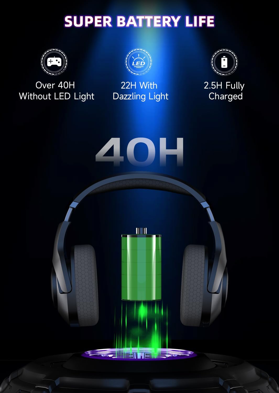 About this itemnVersatile Connectivity: Enjoy seamless gaming with this wireless headset that offers multiple connectivity options – 2.4GHz wireless for low-latency gaming on PC, PS4, PS5, and Switch, Bluetooth for mobile devices, and a 3.5mm audio jack for wired connections.nImmersive Audio Experience: Featuring a 50mm dynamic driver and large diaphragm, these headphones deliver precise game sound reproduction, capturing every detail from footsteps to gunshots, ensuring an immersive gaming experience.nExceptional Battery Life: Get up to 40 hours of non-stop gaming on a single charge, with the option to enable RGB lighting for up to 25 hours of usage. Voice prompts alert you when the battery is low, and a quick 2.5-hour charge time keeps you in the game.nComfortable Design: Crafted with professional-grade breathable mesh fabric and an ultra-light build, these headphones offer superior comfort for extended gaming sessions. The adaptive ear shell design and wide headband protection ensure a personalized, feather-light fit.