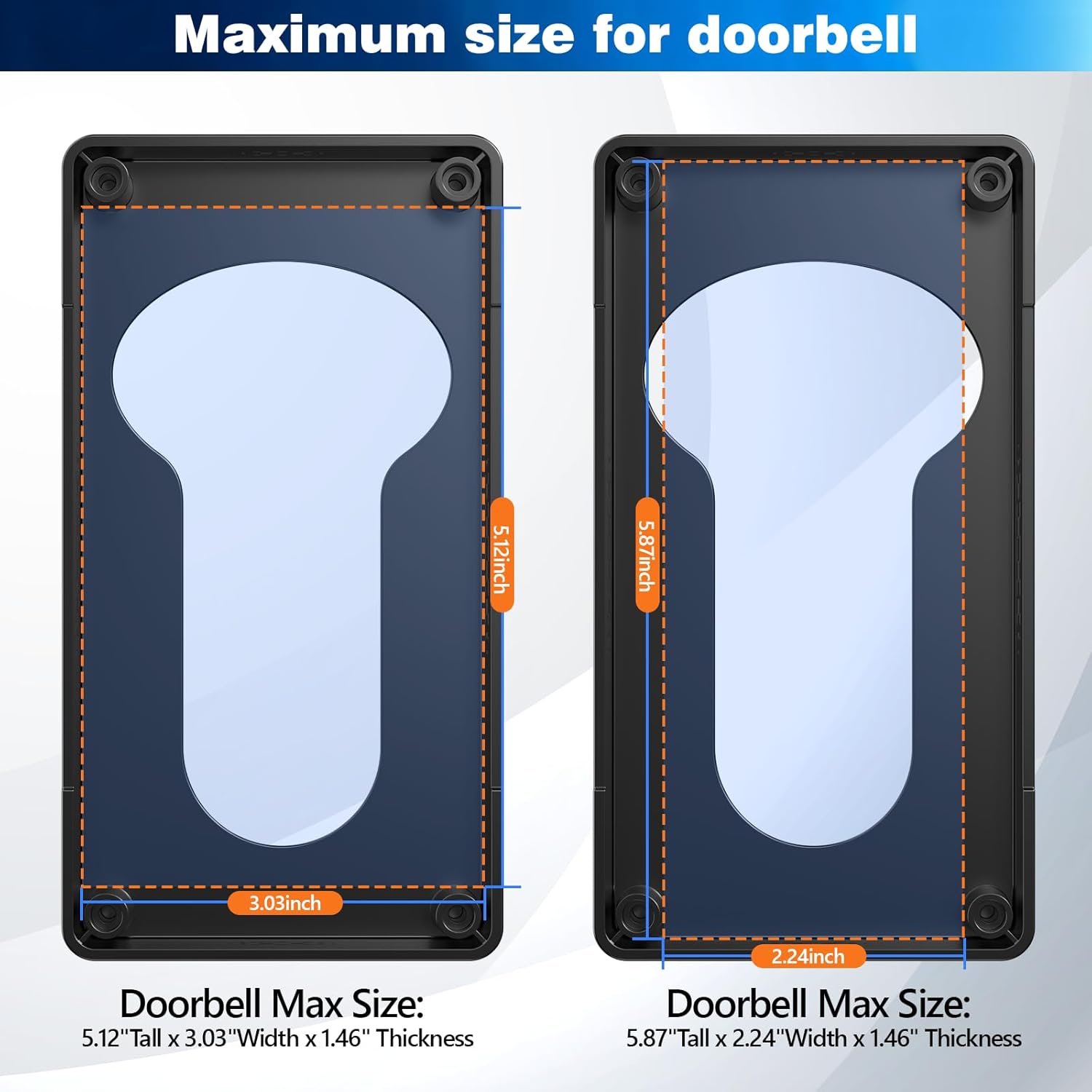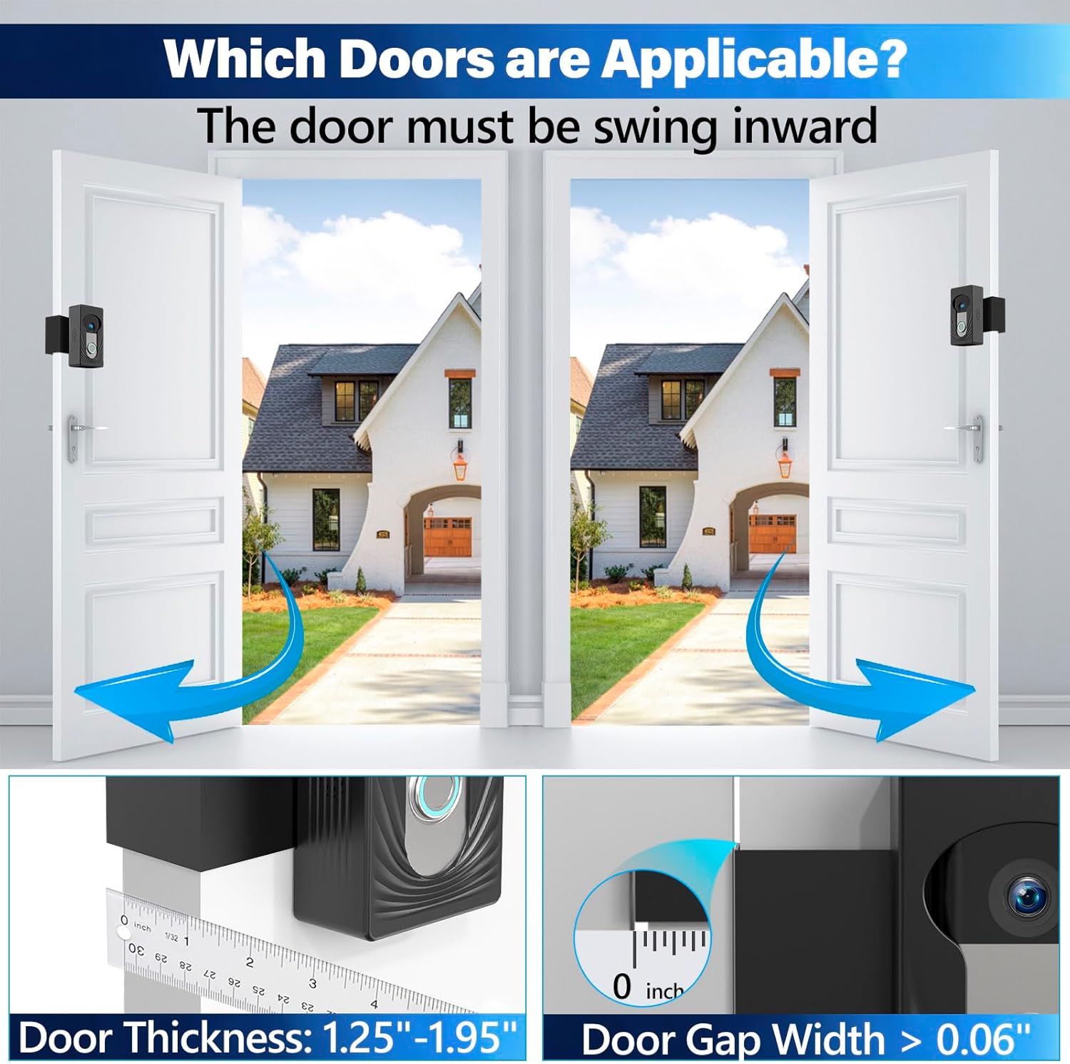 Compatible With Multiple Wireless Doorbells: Trushome doorbell mount is used for different sizes of doorbells by filling the inside with sponges of different thicknesses. compatible with Ring doorbell 4/3/2/1 & Ring video Doorbell(2nd Generation-2020 Release)& Ring video Doorbell 3 Plus &Ring battery doorbell plus(2023 release)& Ring battery Doorbell Pro(2024 Release), Blink doorbell, Eufy doorbell S220/C210. Note: Only for wireless video doorbells, not for wired ones (doorbell not included).nSuitable for 1.25inch-1.95inch thick doors: The anti-theft doorbell mount with no drill is only suitable for the thickness of the door is 1.25inch-1.95inch, and the gap between the door and frame is more than 0.06inch. So you must measure your door before buying.nWhat type of doors are suitable for?: The doorbell mount is only suitable for inward-opened doors. Please carefully note that the outward-opened doors& storm doors& screen doors are not suitable.nNo Drill Doorbell Mount: The anti-theft door mount is fixed with double screws, more stable than the ordinary single-screw doorbell mount. No drilling design can avoid damaging the integrity of the door panel and the newly designed front face opening does not affect the doorbell’s motion detection sensor.nEasy Installation & Cooling Design: You can install a doorbell mount in seconds. Place the video doorbell into the door mount, then adjust the setting screws according to the thickness of the door. We have designed many mesh holes around the doorbell mount, which is conducive to heat dissipation of the doorbell and makes the doorbell last longer.nQuality After-Sales Services: Trushome has always been committed to providing customers with a better shopping experience. If you are not satisfied with our products, please feel free to contact us, and we will help you solve the problem within 24 hours as soon as possible.n› See more product details