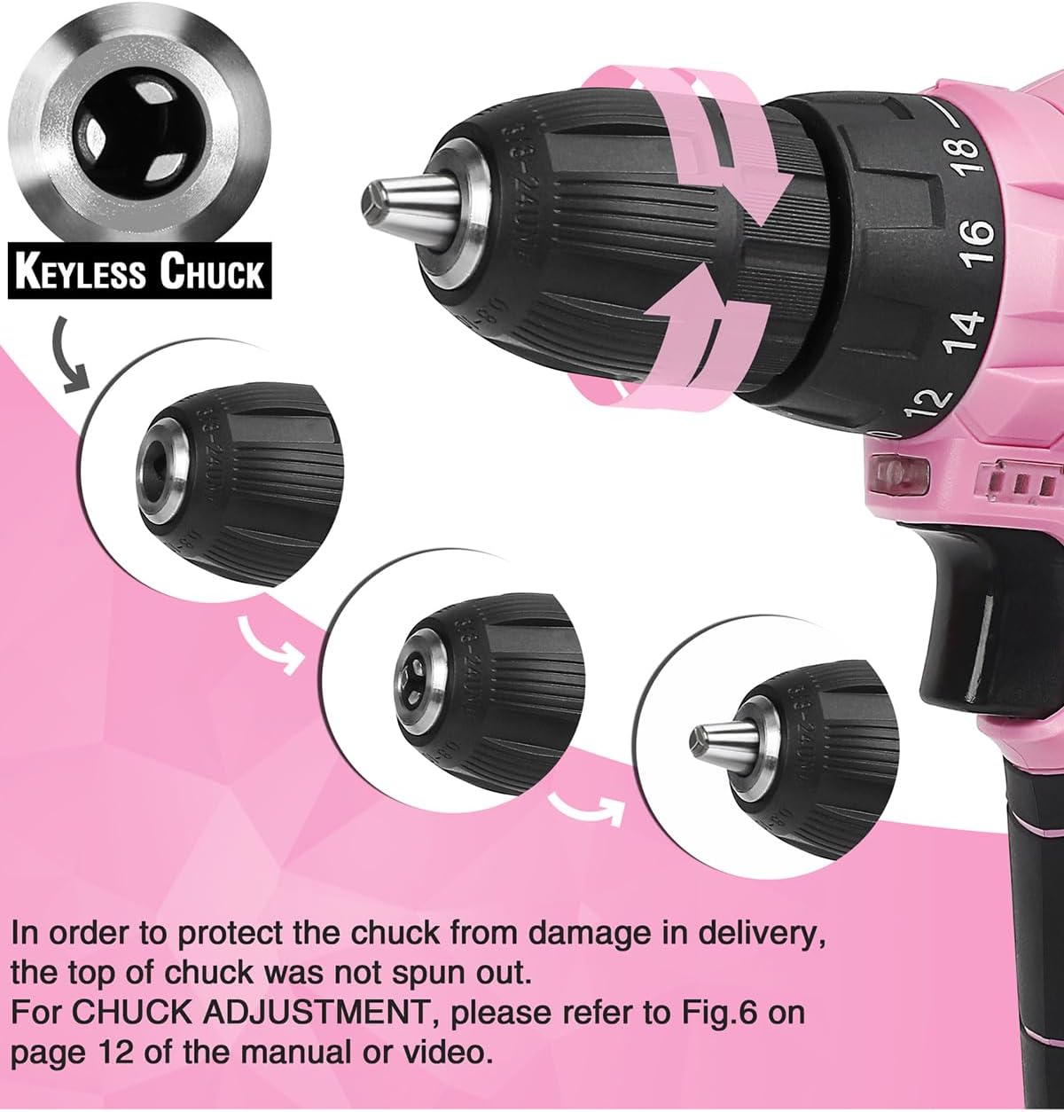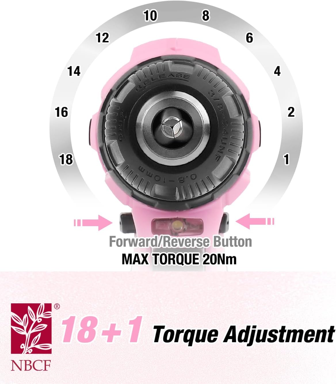 About this itemnPerfect present for Christmas, Mother’s Day, Birthday, Anniversary, Valentine’s Day, etcnPINK RIBBON: WORKPRO Tools is proud to partner with National Breast Cancer Foundation, Inc.(NBCF) to support those affected by breast cancernSuper Safe & Lightweight & Ergonomic: Our lightweight drill is built especially small and light ( only weighs 1.8 lb. ). It has an ergonomic and comfortable handle so women and smaller men can easily use it. Being so small and compact also helps make it maneuverable and easy to use in tight spaces. Trigger-activated LED light for extra security and safety when you work in dark areasnWidely Applications: Our WORKPRO high-quality drill set is ideal for hanging pictures, assembling or repairing furniture, tightening screws, and many other DIY and craft projects. Our drill is also a perfect gift for your mom, wife, girlfriend, daughter, or an independent friendn3/8 Keyless Chuck & Forward/Reverse Control: 3/8