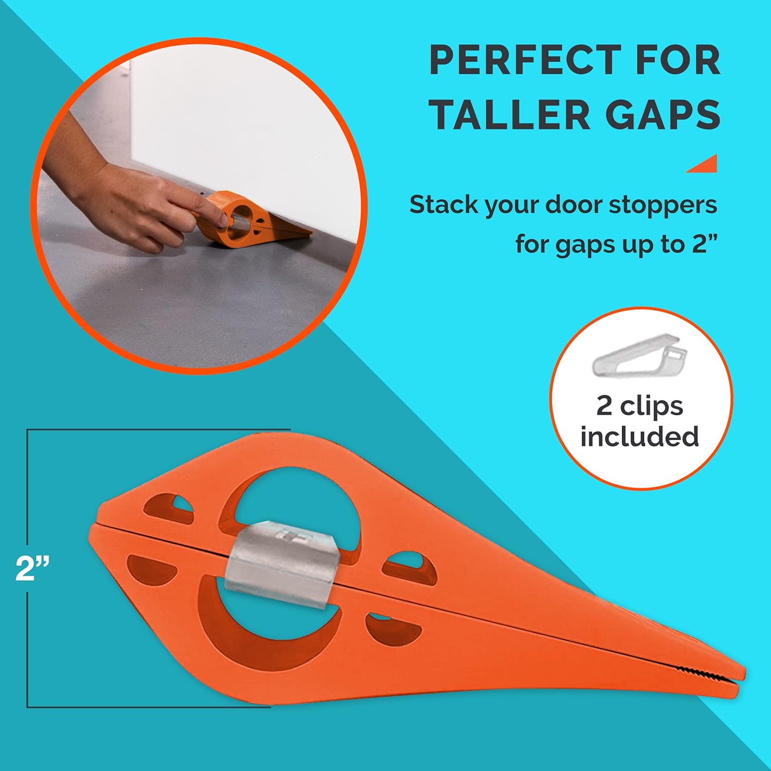 About this itemnSAFETY FIRST – Whether you’re moving furniture, letting a breeze in, or preventing little hands from getting pinched, this heavy-duty door stopper stays put.nAFFORDABLE SECURITY – Our door stops aren’t just for letting it all in, they’re also great for keeping it all out. Secure the bottom of your door from the inside.nGREAT FOR TALLER GAPS – Our versatile door jam can be doubled up with ease for large door gaps. Just grab a multi-pack and use the included clips to double the size.nWORKS ON ALL SURFACES – With a powerful grip, this door holder works perfectly on any surface, including carpet, stone, linoleum, wood, and concrete.nADHESIVE STORAGE INCLUDED – Our rubber door stopper comes with a convenient, adhesive holder to keep your wedges out of sight and out of the way.n› See more product details