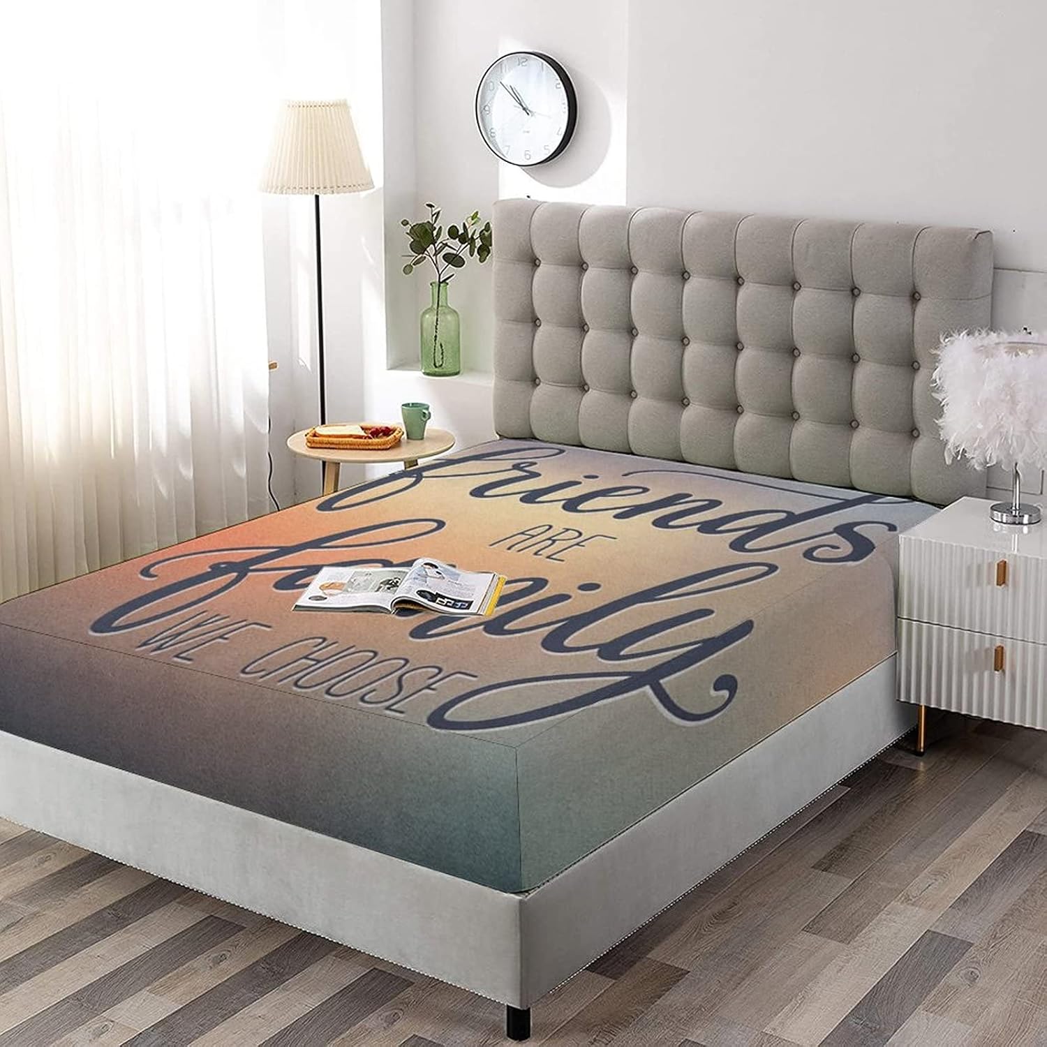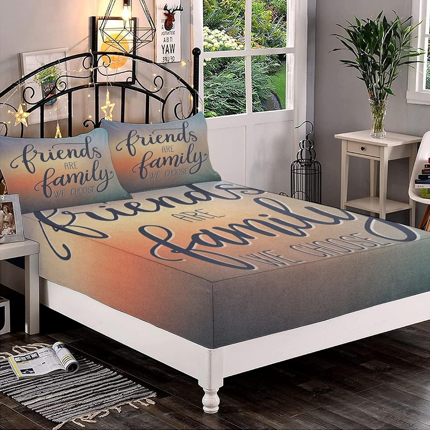 XISUNYA Decorative Fitted Sheet Set Twin Size, Family Deep Pockets Fitted Sheet & 2 Pillow Sham Set, Friends are Famly We Choose Inspirational Phrase Fashion Printed Microfiber Bedding 3pc Set