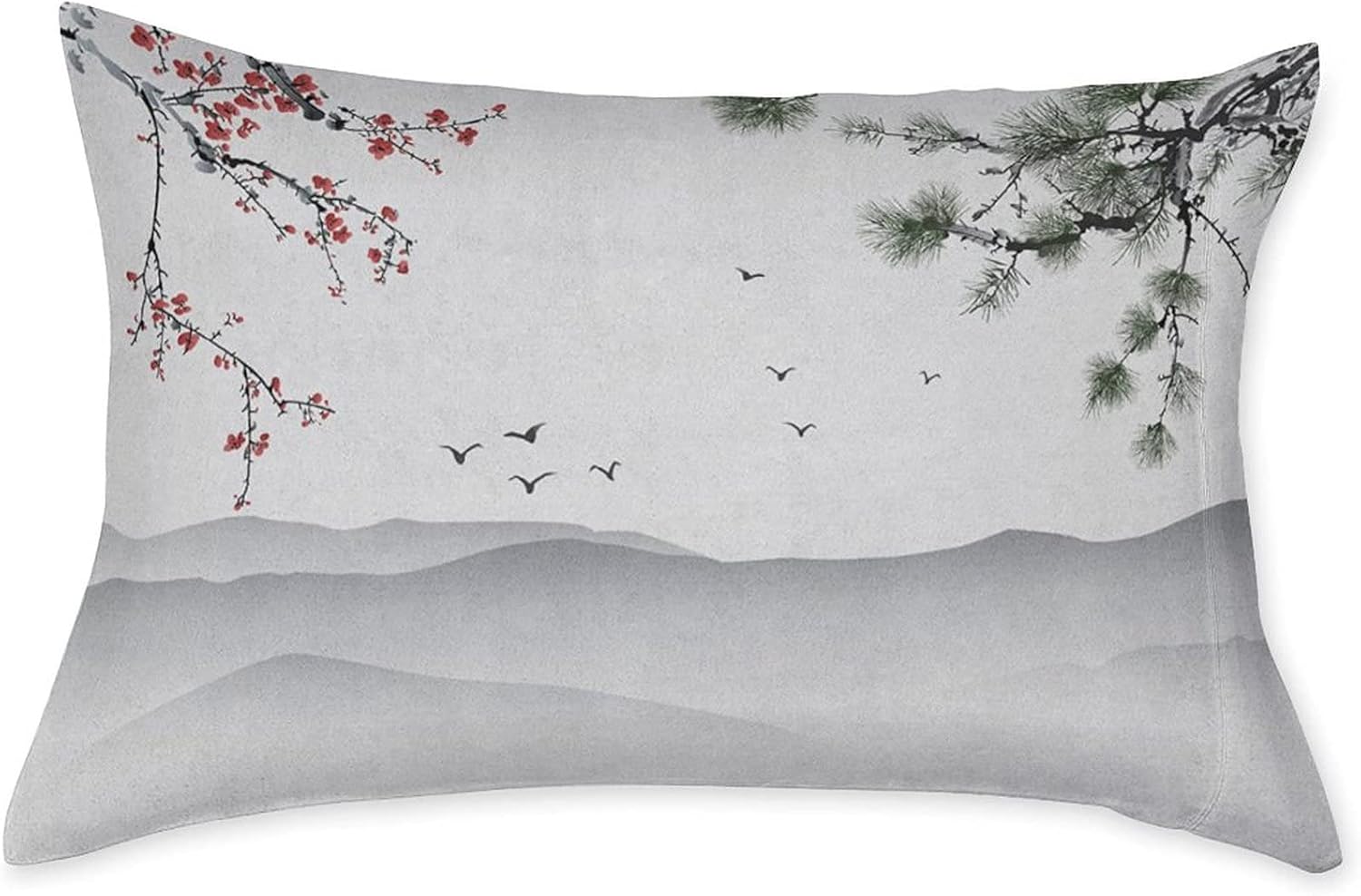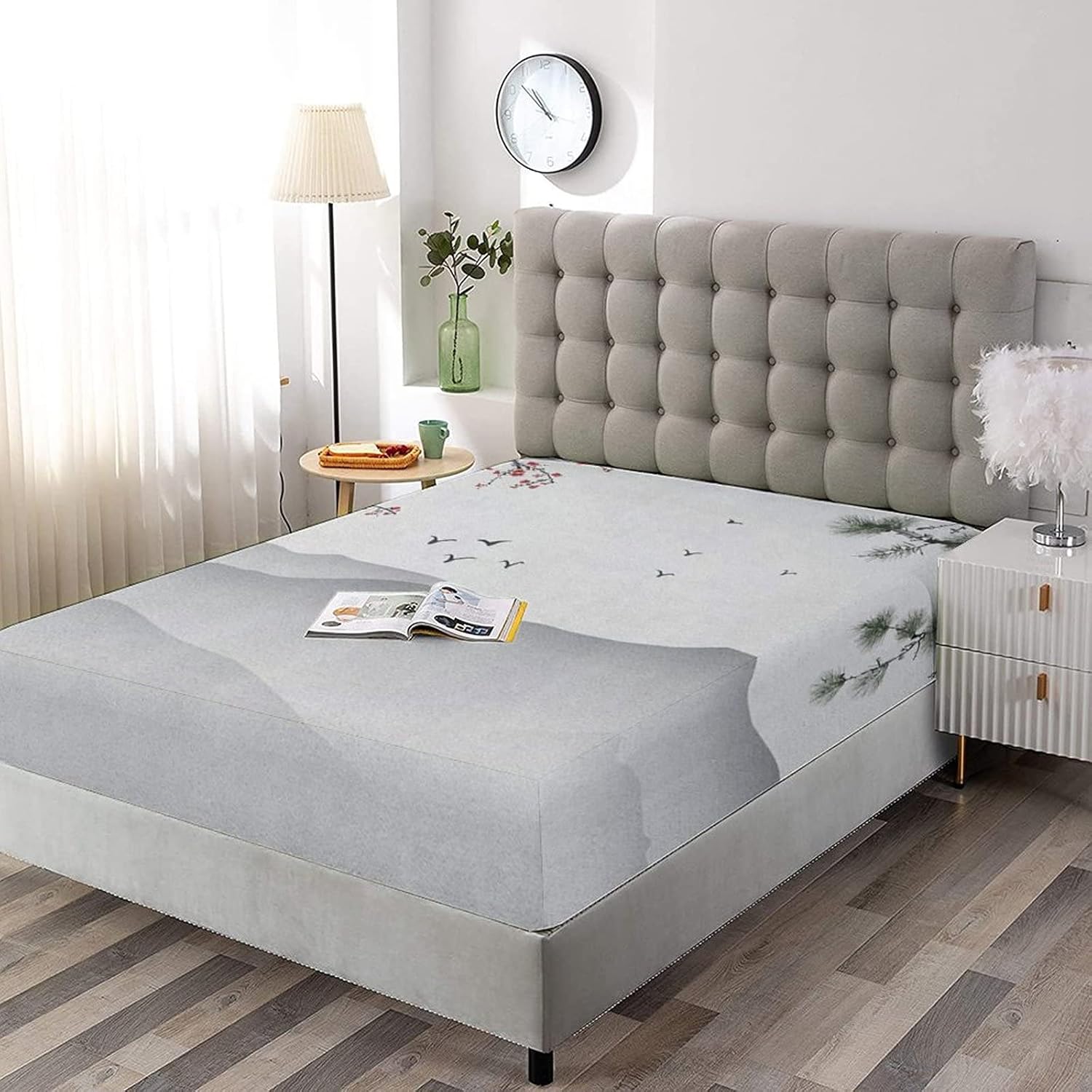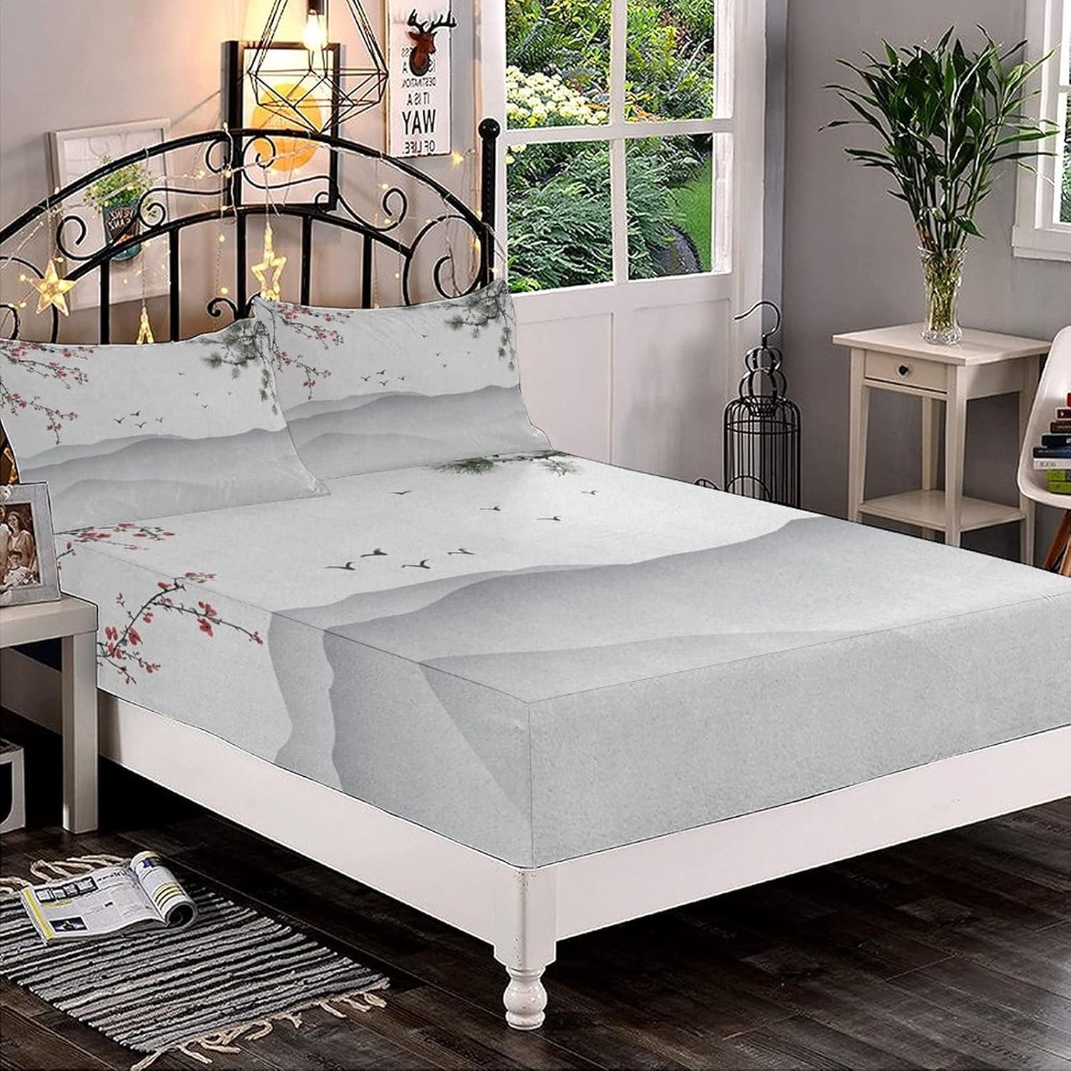 XISUNYA Decorative Fitted Sheet Set Twin Size, Floral Deep Pockets Fitted Sheet & 2 Pillow Sham Set, Chinese Painting Tree Branches Birds Mountains Landscape Art Printed Microfiber Bedding 3pc Set