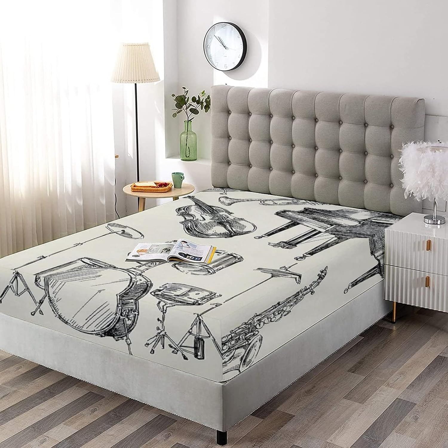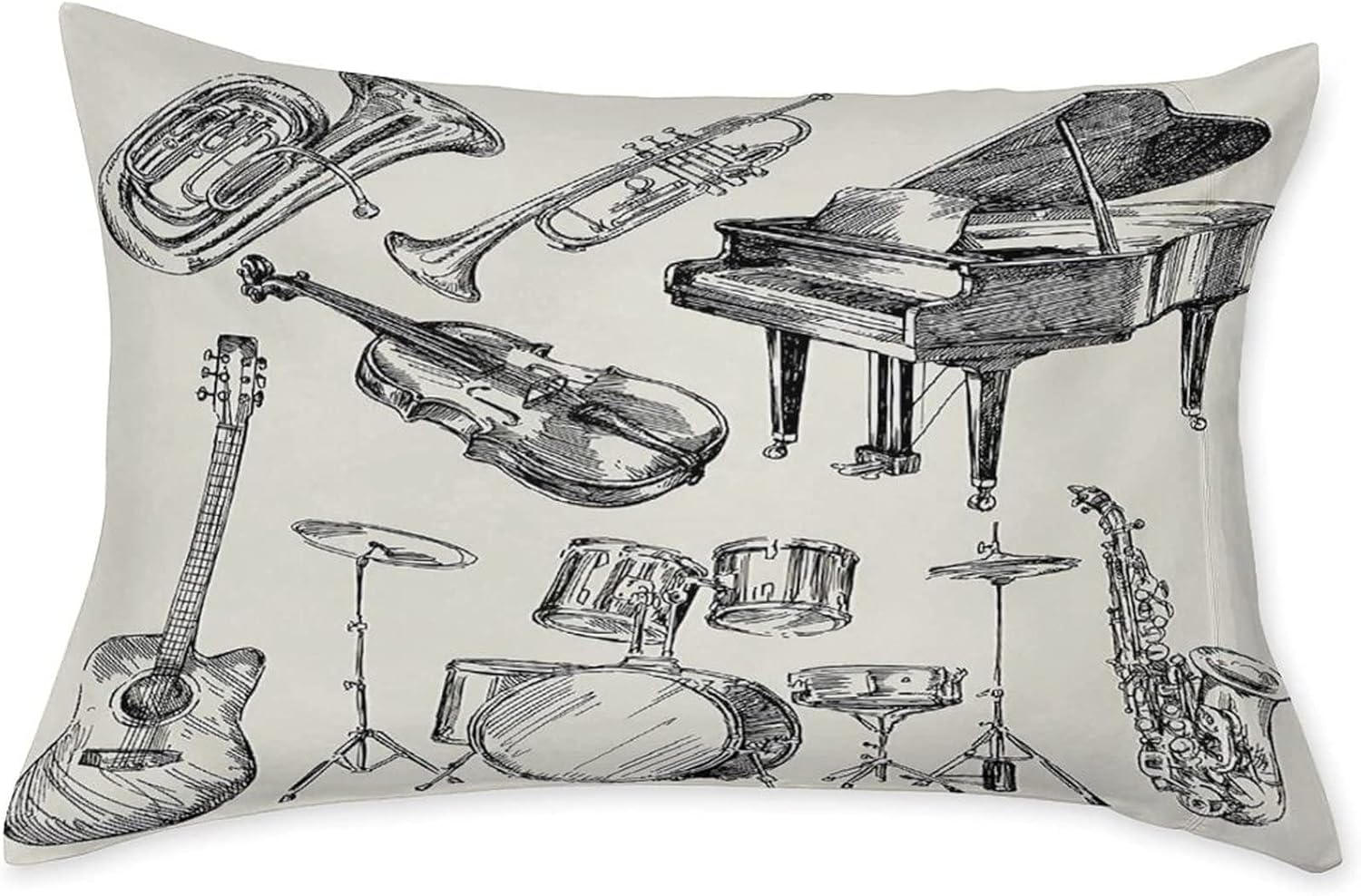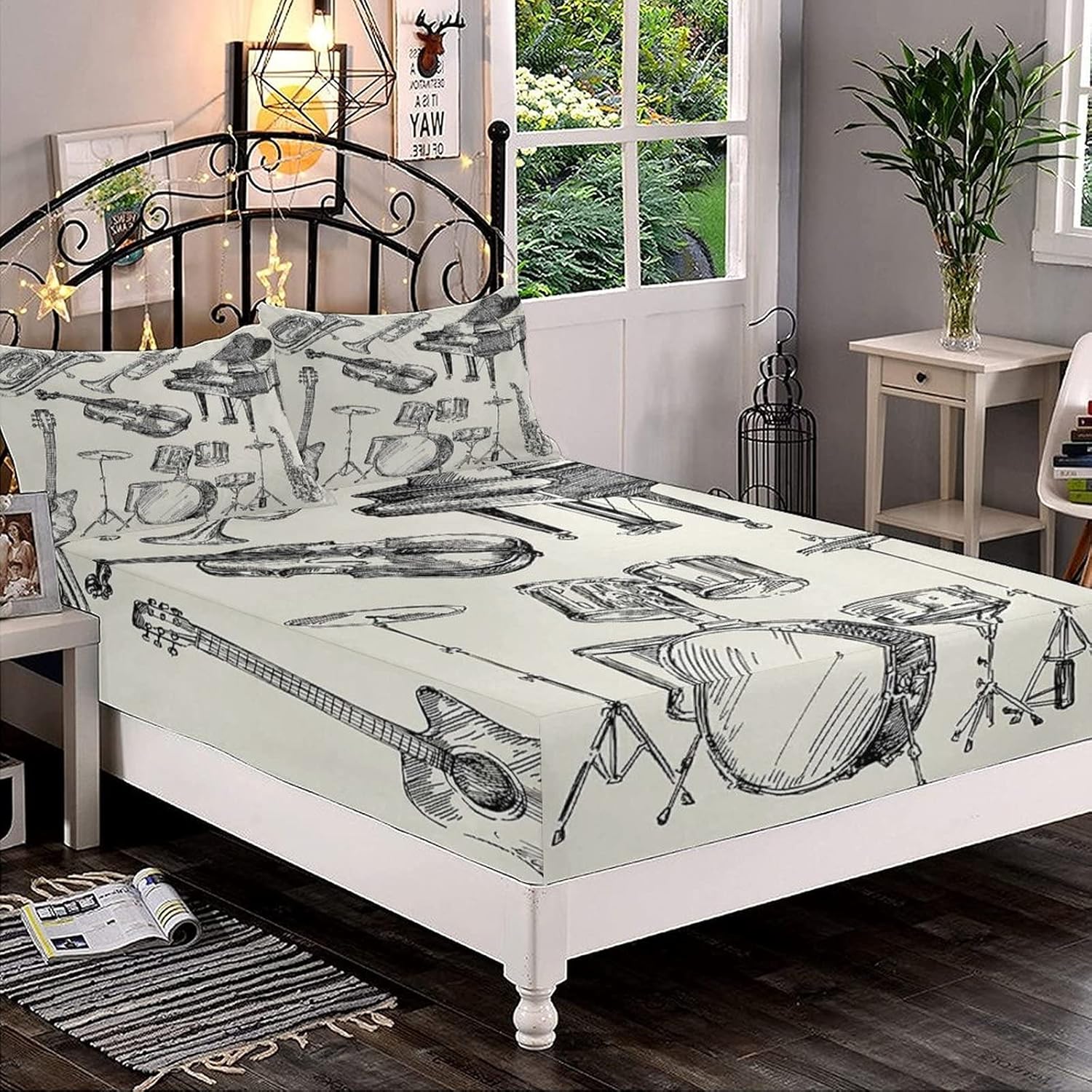 XISUNYA Decorative Fitted Sheet Set Twin Size, Jazz Music Deep Pockets Fitted Sheet & 2 Pillow Sham Set, Musical Instruments Sketch Trumpet Piano Guitar Printed Microfiber Bedding 3pc Set