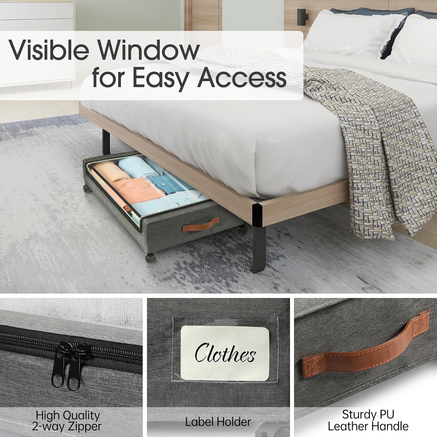 About this itemn300D PU FabricnHold Up to 66lbs: Yecaye under bed storage with wheels is made of high quality 300D PU fabric and sturdy metal frame, can hold up to 66 lbs, stronger than other fragile metal mesh, spacious capacity perfect for storing clothes, toys, books, shoes and other heavy items also won’t compromise stability and durabilityn360°Rotating Silent Wheels: Say goodbye to constantly carrying heavy storage boxes around your house.This under bed rolling storage comes with 4 x 360°rotating wheels,two of which have locking function.When you need it to remain stationary, just press the locking mechanism gently. No matter how full the cart is, adults and children can easily slide on the floor and carpetnClear Window & Label: Our rolling underbed storage bins are equipped with a Clear window, you can clearly see the stored items, say goodbye to the trouble of misplacing items. Additionly, the included label is great for labeling contents, allowing you to quickly identify and find the item you’re looking for without having to open multiple containers or boxesnVersatility: Under bed shoe storage dimensions:30.71 x 16.93 x 6.69 inches (with wheels), (applicable under-bed height > 6.7in), large capacity exceeds your expectation to store more daily items. It can be placed under beds, sofas, tables, and closets to maximize unused space. In addition, this under bed storage drawers can be folded up when not in use, perfect for small families and college dorms that need extra storage spacenEasy to Install: This rolling storage bin is designed to easy installation and hassle free.Including user-friendly instruction and require minimal effort to set up, which also means you can quickly install and utilize the underbed storage space,saving valuable time and effort,ideal for bed rotting, the blind, and seniors with mobility issuesn See more product details