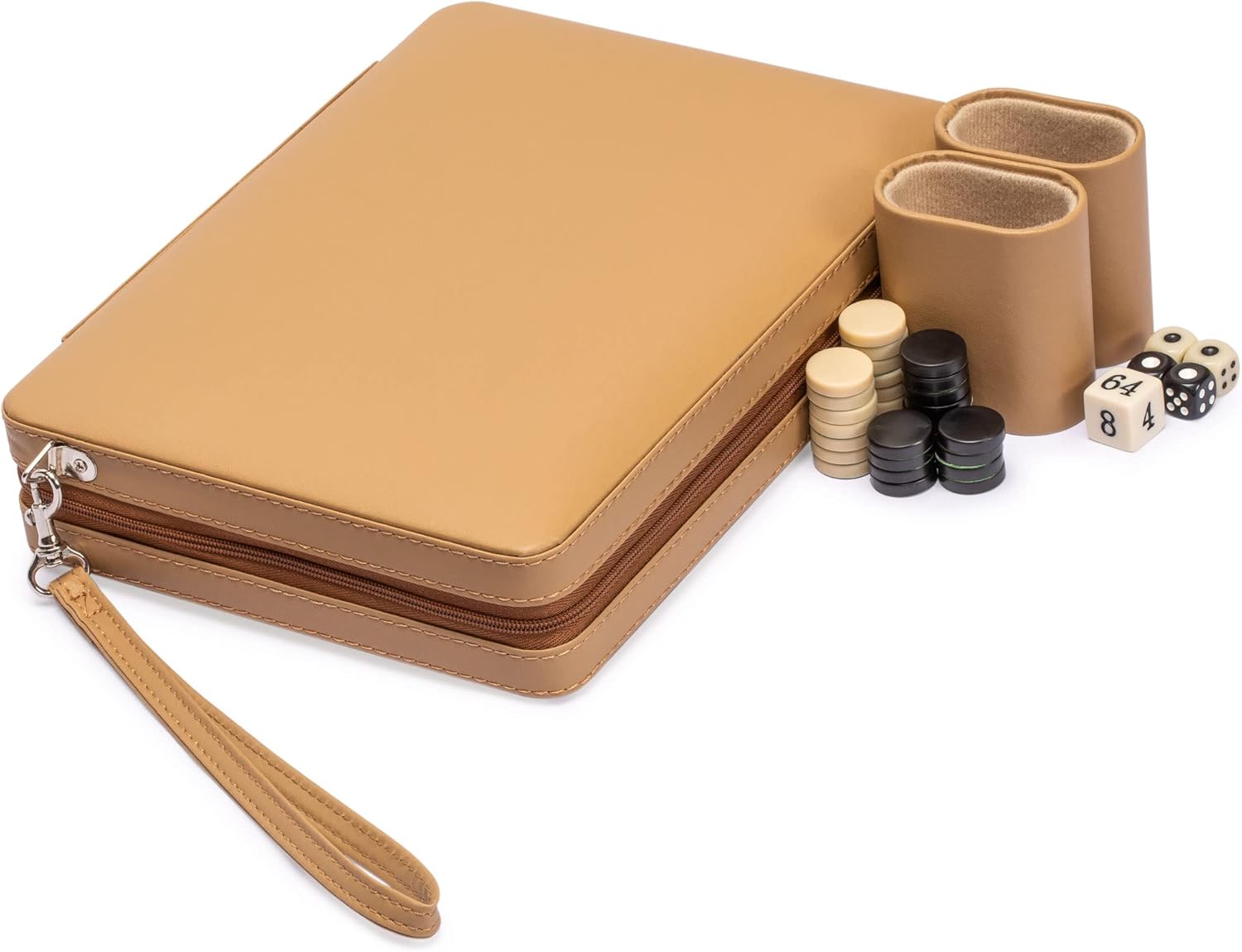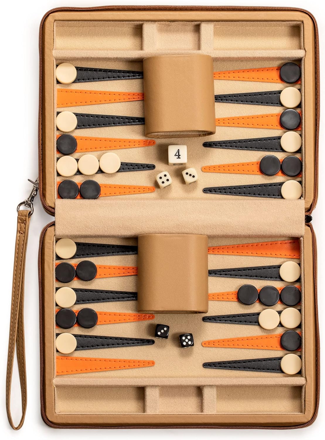 Magnetic Travel Set: Stitch bound leatherette board with quality magnetic feature for uninterrupted gameplaynMini Backgammon: This 9.3-inch (23.5-centimeter) set folds in half with all checkers and accessories inside, for compact storage and carry; Kept secure by zipper, the case measures 9.3 x 7 x 2 inches (23.5 x 18 x 5 centimeters) when closed and measures 14 x 9.3 x 1 inches (35.5 x 23.5 x 2.5 centimeters) when opennNifty Playing Surface: The board comes with velour playing field with black and orange leatherette pips and organizational sections for checkers and accessories; Lightweight and foldable, this set is ideal for trips and on-the-go games; Tuck it away without taking up spacenComplementing Accessories: Set includes two sets of 15 plastic checkers with quality magnetic features for uninterrupted play; Each measures 0.7 x 0.2 inch (18 x 5 millimeters); Also included are 4 dice, 1 doubling cube, and 2 leatherette dice cupsnBenefits of Backgammon: Backgammon is an exciting game known to help improve memory and problem-solving skills; It’s also a helpful tool in teaching kids about math and probability
