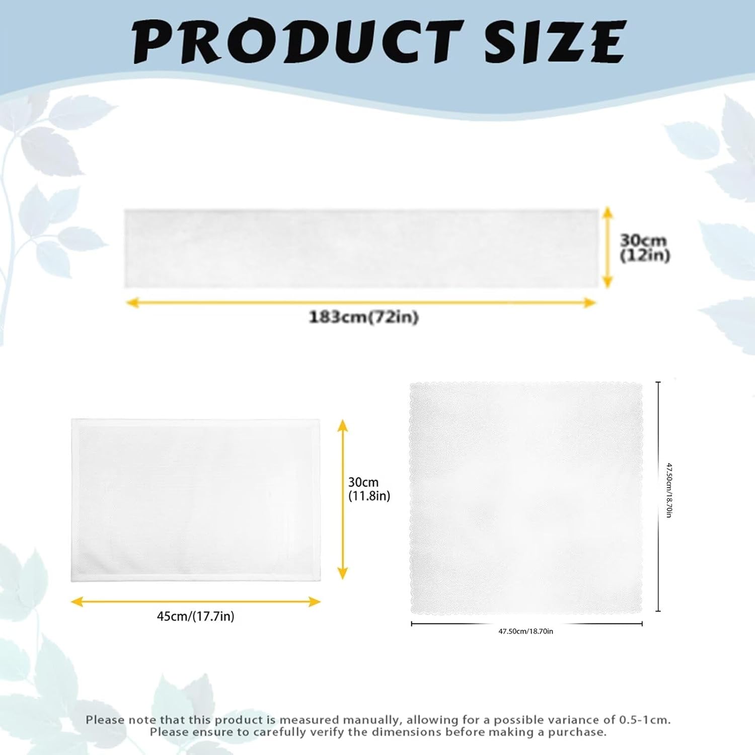 About this itemnPolyesternMaterial : Made of Double Layer polyester, sturdy sewing, soft and durable, protecting your table’s surface from hot pans, scratches, and spillsnBright Home Decor : Add flair to your home decor with Buxolandt colorful table runners,Placemats and Napkins Cloth Set. Kitchen dining daily use themed party decoration, birthday party, Valentines, Easter holiday and special events celebrationnFits Table Size : This table runner is 12 x 72 inch, Placemats is 12 x 18 inch, Napkins Cloth is 18 x 18 inch, appropriate for a table that can seat 4 people, match your table and give you a delightful dining experiencenPackage Content: 1 X Table Runner 4 X Placemats 4 X Napkins Cloth Easy to Clean : Machine Wash / Hand Wash Andairdry,The Temperature Of The Washing Solution Should Not Exceed 45ºC.nDesigned with You in Mind : Buxolandt table runners are designed by professionals. Vibrant color and unique pattern print offers you creative and unique idea to decorate home Package