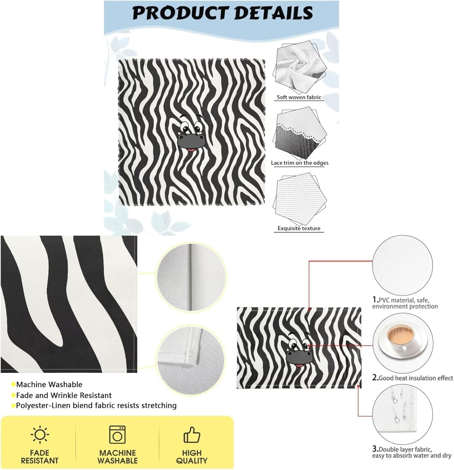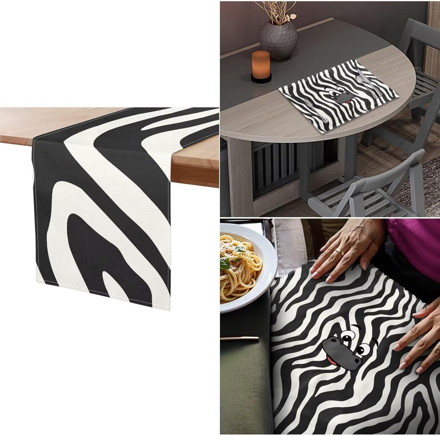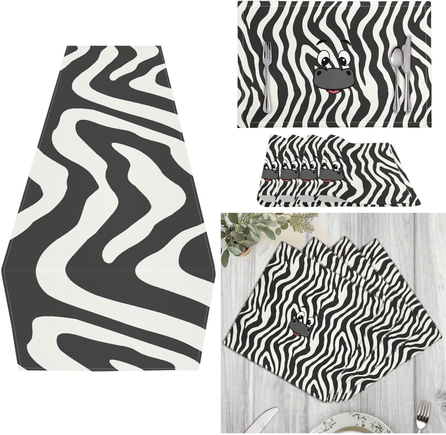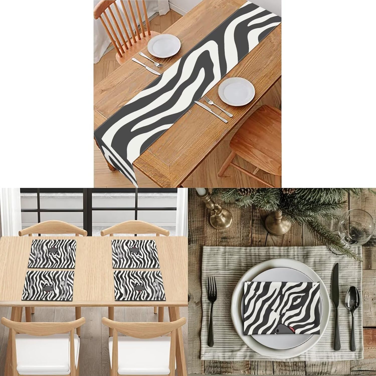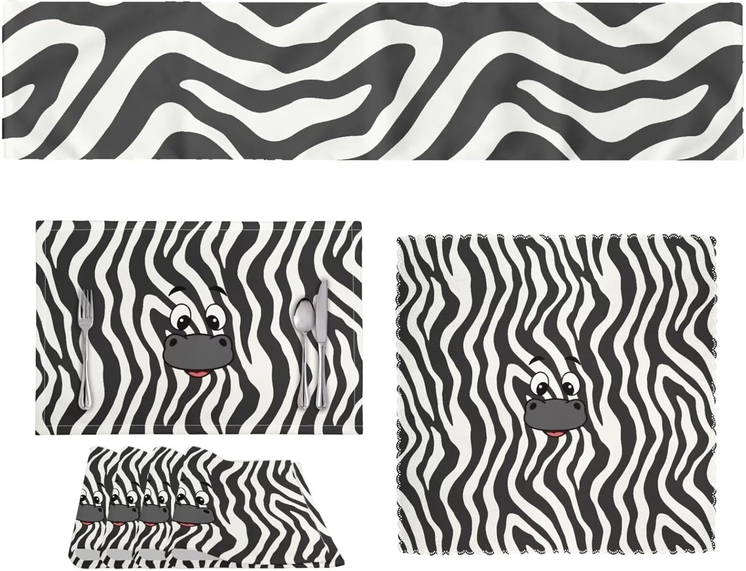 Zebra Stripes Print Table Runner Set with Matching Placemat Napkins Cloth Farmhouse Dining Table Decor for Wedding Kitchen Dining Daily Use Holiday Party Grey