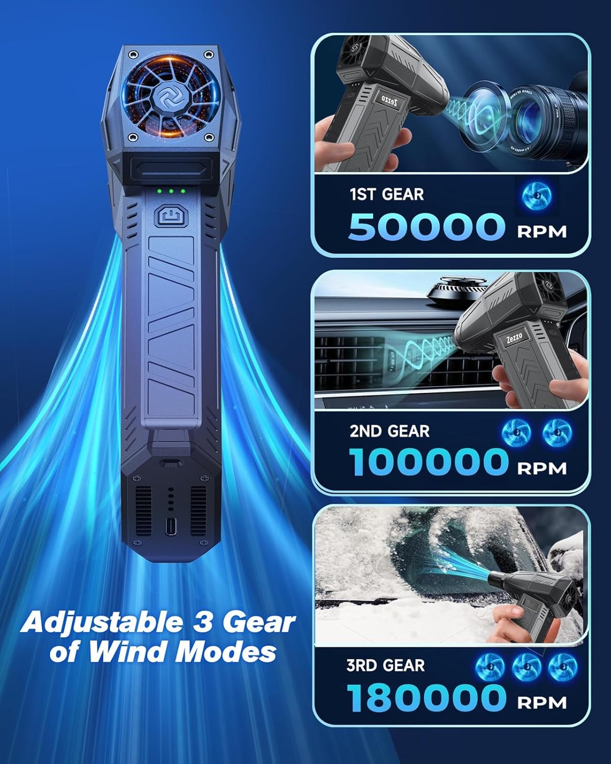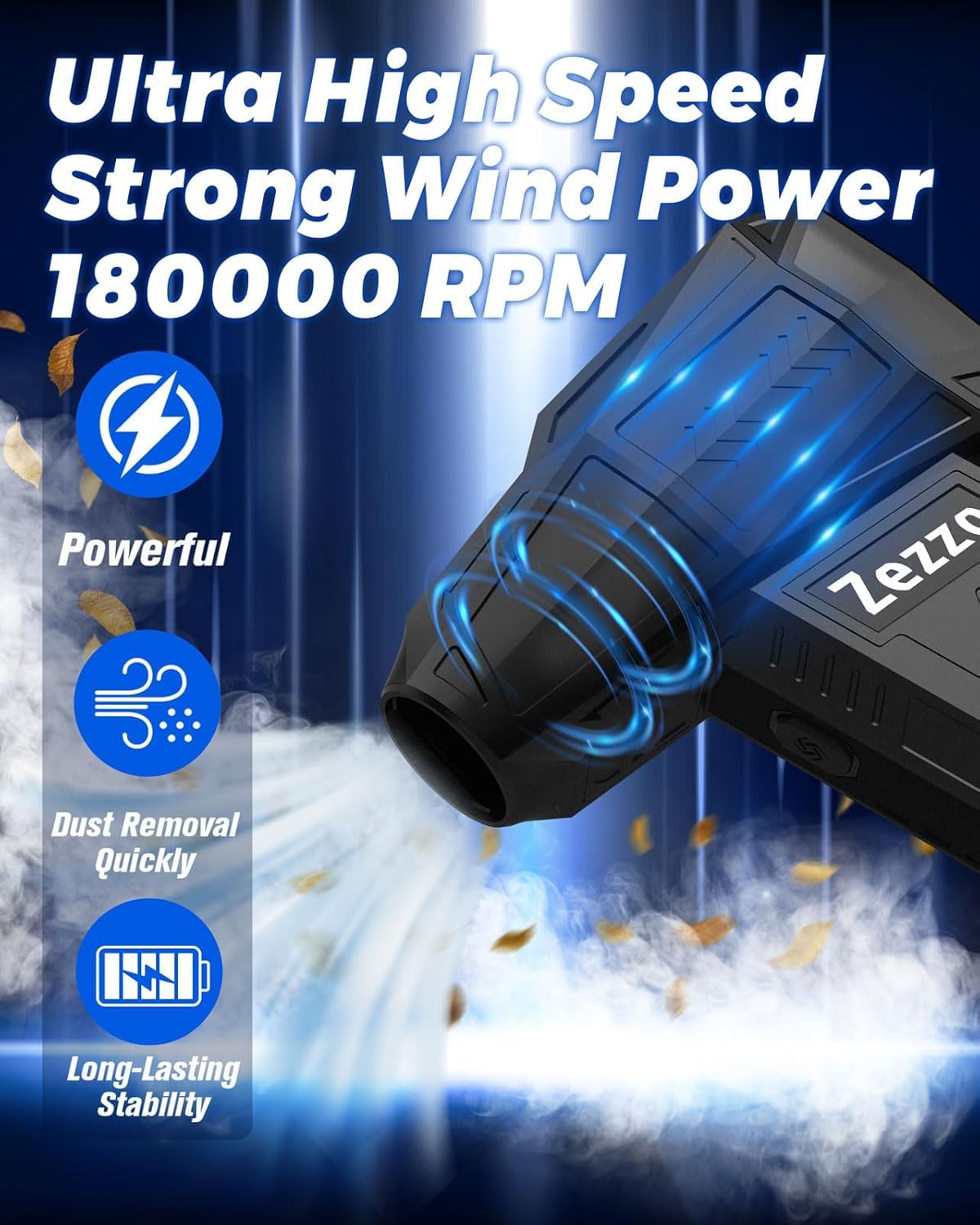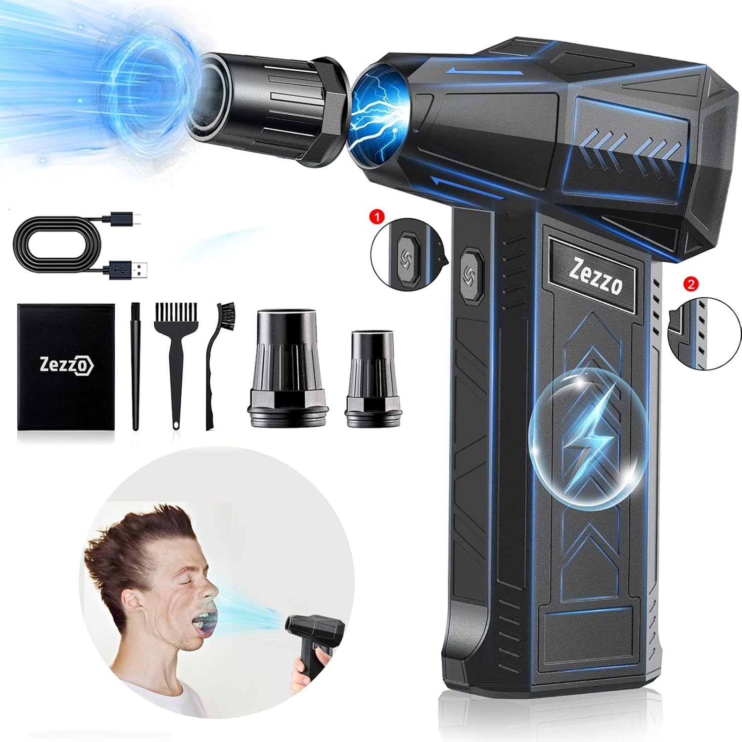 Zezzofan Compressed Air Duster,180000RPM Mini Electric Air Duster,Powerful Blower High Speed Duct Fan,3 Adjustable Rechargeable Cordless Air Broom for Keyboards Home Outdoor Dust Rain Snow Removal