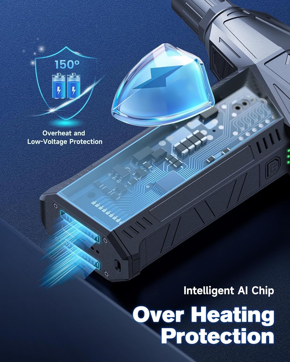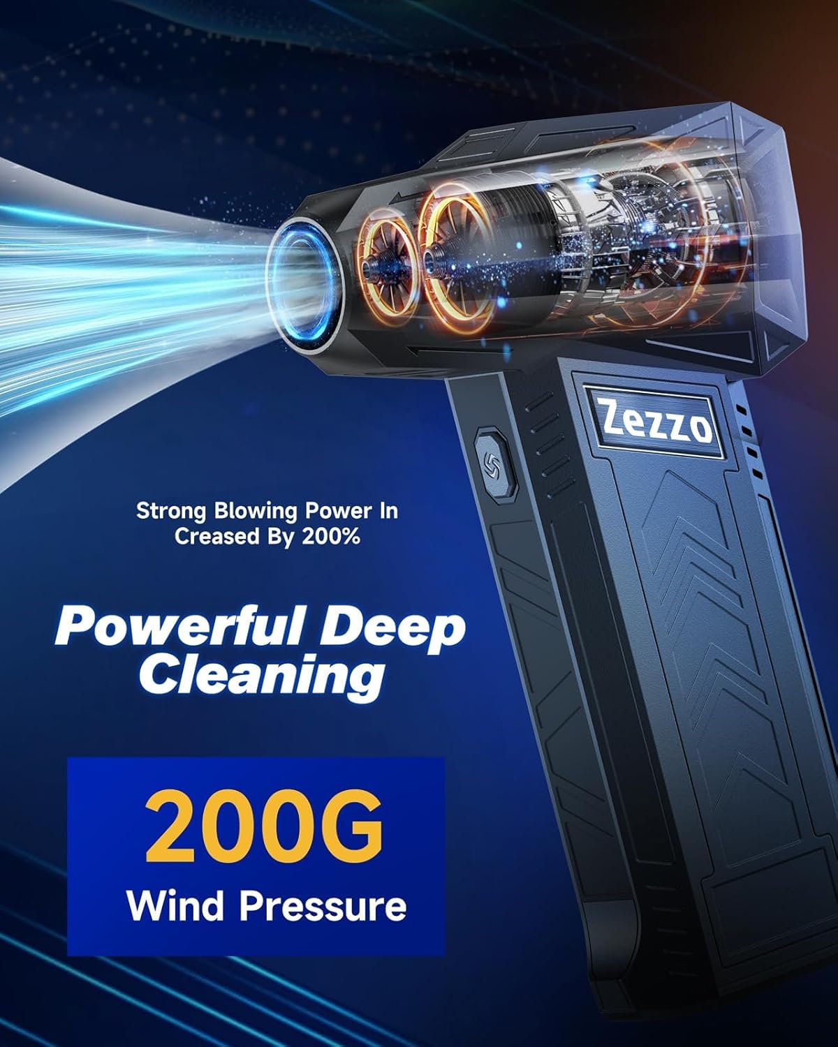 About this itemn?Zezzofan Electric Compressed Air Gun?High speed air dust collector, strong performance, the maximum blowing force is 200g, and the peak wind speed is more than 45m/s. It can easily remove dirt hidden in various crevices of the keyboard or any electronic device, making it extremely convenient to use in a home, office, or car dust collector.n?Powerful Blower with High Speed Duct Fan?3 adjustable airflow settings, allowing you to customize the airflow to meet different cleaning needs. Provides efficient cleaning. Built-in large-capacity battery (the battery is equipped with temperature protection, current protection, and short-circuit protection). And it supports 10W fast charging.n?High Material Air Duster?The cordless air dust collector is made of high hardness and high temperature resistant materials, with perfect texture, strong explosive power, low calorific value, easy to carry, light weight and comfortable to hold. Ensure a more convenient and long-lasting user experience.n?Alternative to Compressed Air?Compared with compressed air tanks, our air dust collector is more environmentally friendly and energy-saving, the cordless blower can be recharged and used repeatedly, no liquid or ice will be formed during the cleaning process, and your electronic equipment is protected from liquids.n?Multi-Purpose Air Blaster?Electric blowers are ideal for cleaning small, narrow and difficult places such as computer keyboards, laptops, cameras, car seats, and blinds, and can also be used to sweep snow, clean the floor, and pet hair.